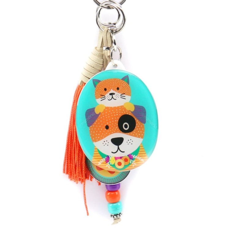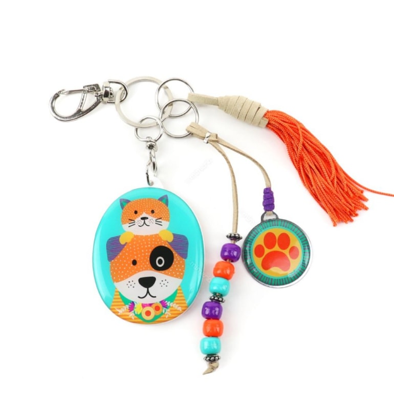 Você ama pets independende que animais são? O Chaveiro Pets é muito fofo! Com o formato da tag oval com um cachorro laranja de bandana verde carregando um gatinho muito lindo!