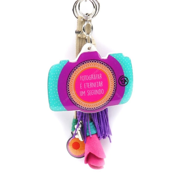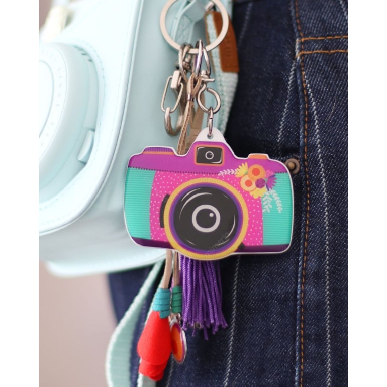 Fabricado em material plástico com resina acrílica, traz também penduricalhos fofos ricos em detalhes que combinam com a estampa, como uma mini câmera fotográfica. No verso do chaveirinho você encontra a frase: "Fotografar é eternizar um segundo".