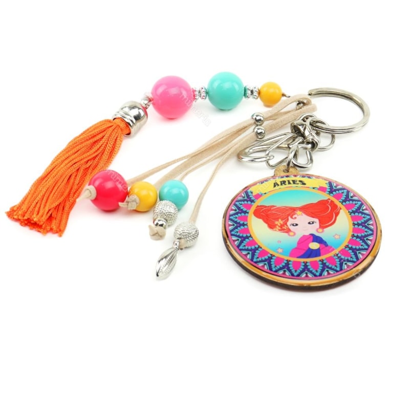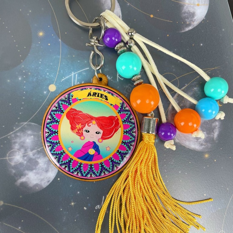 Fabricado em MDF com resina acrílica, com o formato de tag redonda, o Chaveiro Resinado Áries tem estampado uma bonequinha com cabelos laranja simbolizando o signo de leão com vários penduricalhos. Lindo!