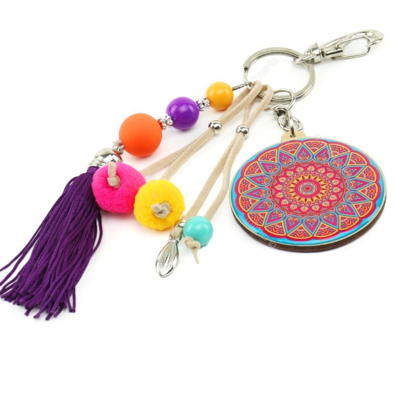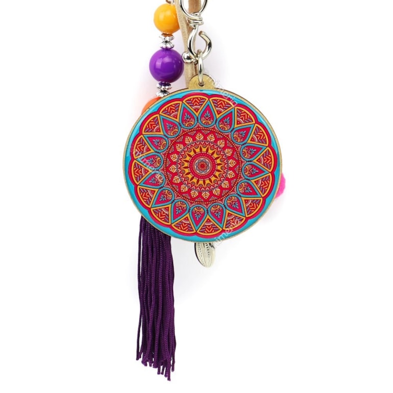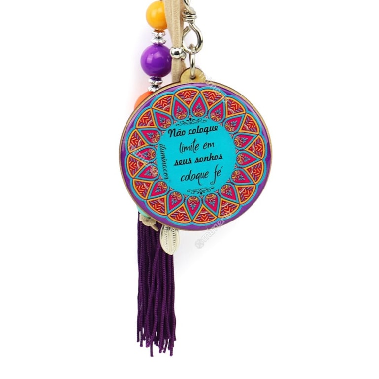 Com ele você pode pendurar suas chaves e ainda enfeitar sua bolsa ou mochila. A tag tem o formato de uma linda mandala super linda e colorida. Fabricado com resina acrílica e traz penduricalhos que combinam com a estampa. No verso tem uma traz a mensagem: "Não coloque limite em seus sonhos, coloque fé”. Que lindo!