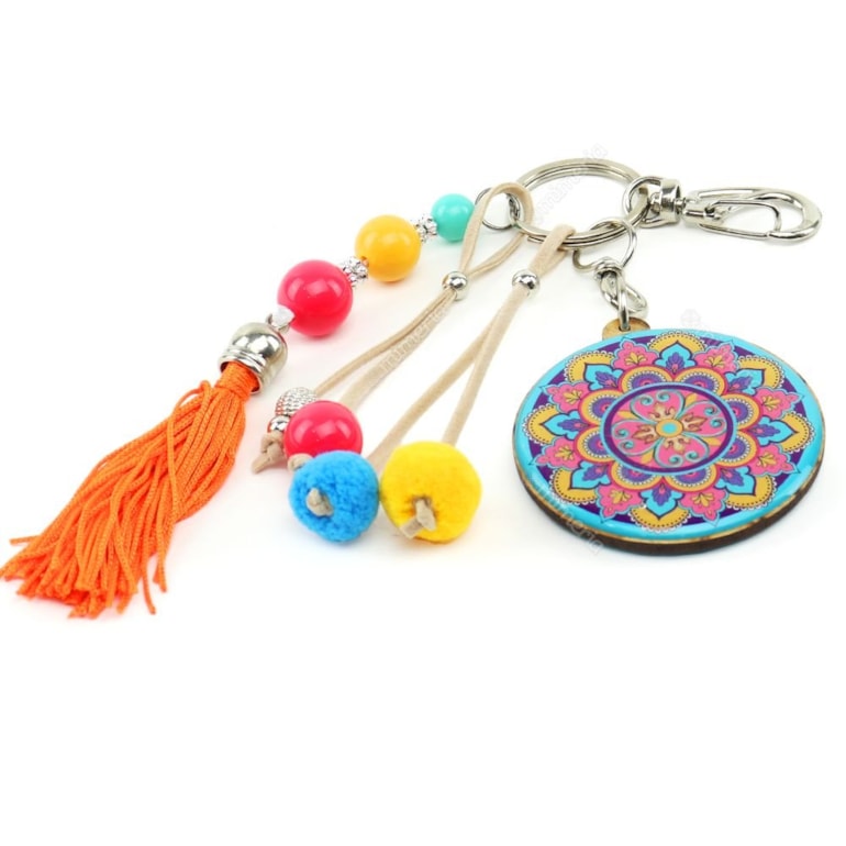 O Chaveiro Resinado Boho vai encantar você! Com o formato da tag redonda, esse chaveirinho traz estampada uma linda mandala nas cores laranja, roxo, rosa e azul turquesa. Linda!l! Em geral, as mandalas são concentração de energia, símbolos da integração e da harmonia.