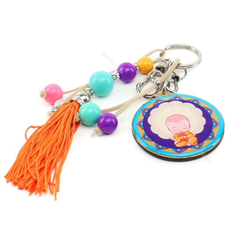 A tag do Chaveiro Resinado Buda tem estampa linda. Fabricado com MDF e resina plástica tem também penduricalhos e no verso a frase: "Eu seguro minha mão na sua, uno meu coração ao seu, para que juntos possamos fazer aquilo que sozinho eu não consigo. Conceda-me, Senhor, serenidade para aceitar as coisas que eu posso modificar, coragem para modificar aquelas que posso e sabedoria para distinguir umas das outras”.