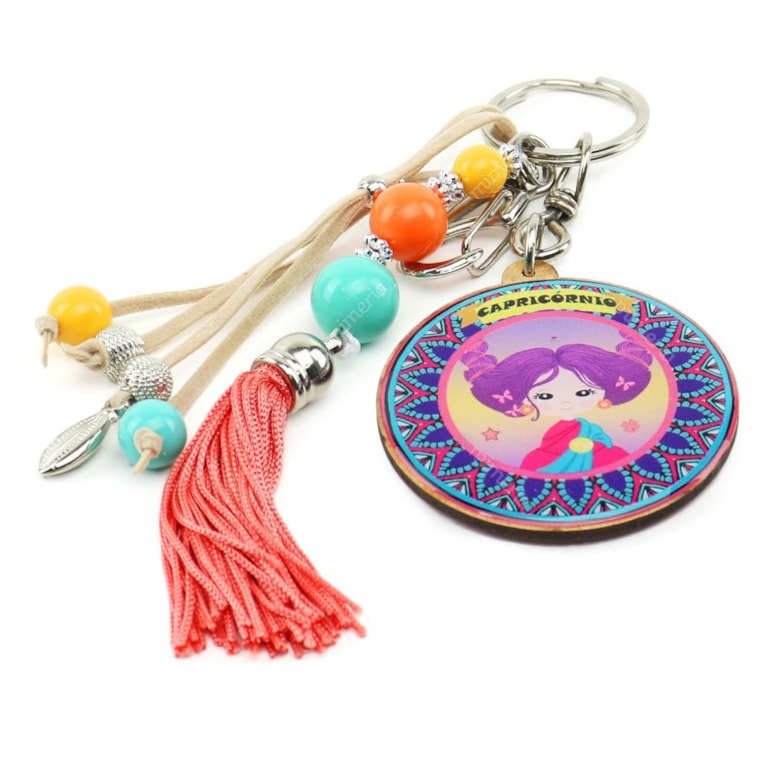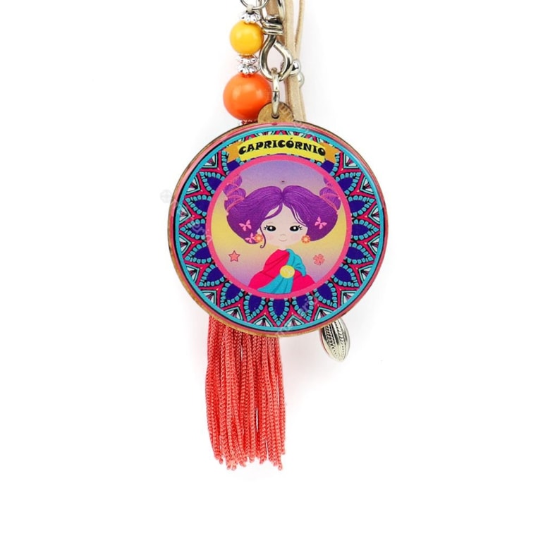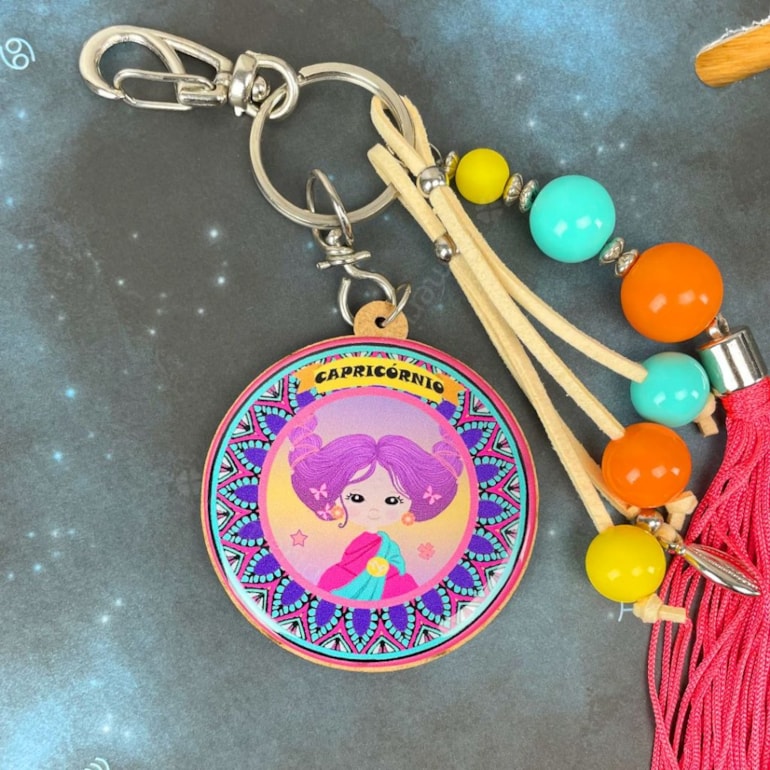 O Chaveiro Resinado Capricórnio é lindo! Fabricado em MDF com resina acrílica, com o formato ato de tag redonda, tem estampado uma bonequinha com cabelos roxos toda estilosa com vários penduricalhos. Lindo!