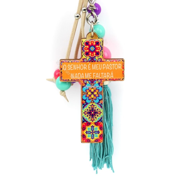 O Chaveiro Resinado Cruz é muito bonito. Fabricado em fabricado em MDF, resina acrílica, ganchinho e argola de metal, e Chaveiro Resinado Cruz traz também penduricalhos. No verso a oração: “O Senhor é meu Pastor e nada me faltará".