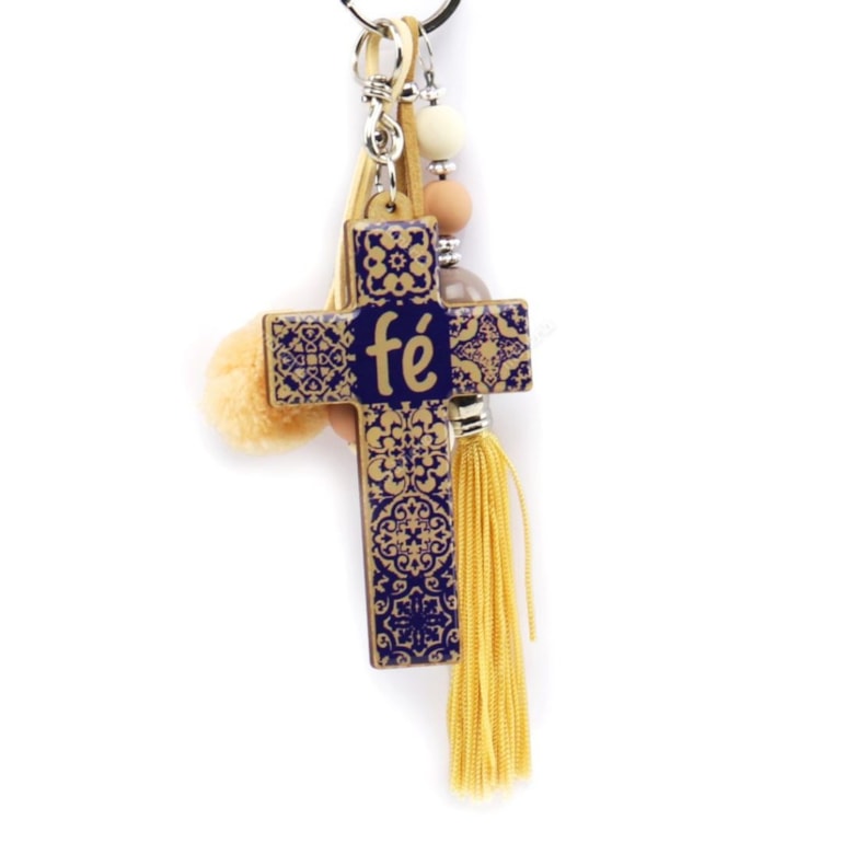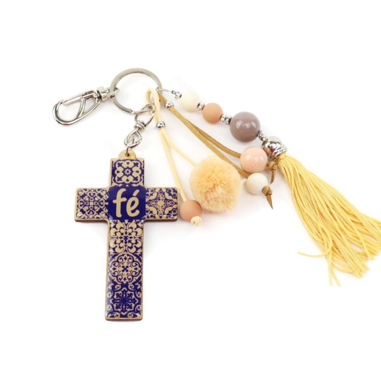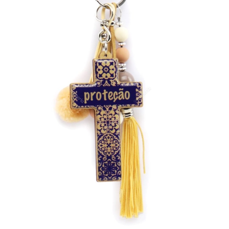 O Chaveiro Resinado Cruz Azul Fé e Proteção vem com penduricalhos charmosos com missangas e pompom de cores neutras. Um mimo!
