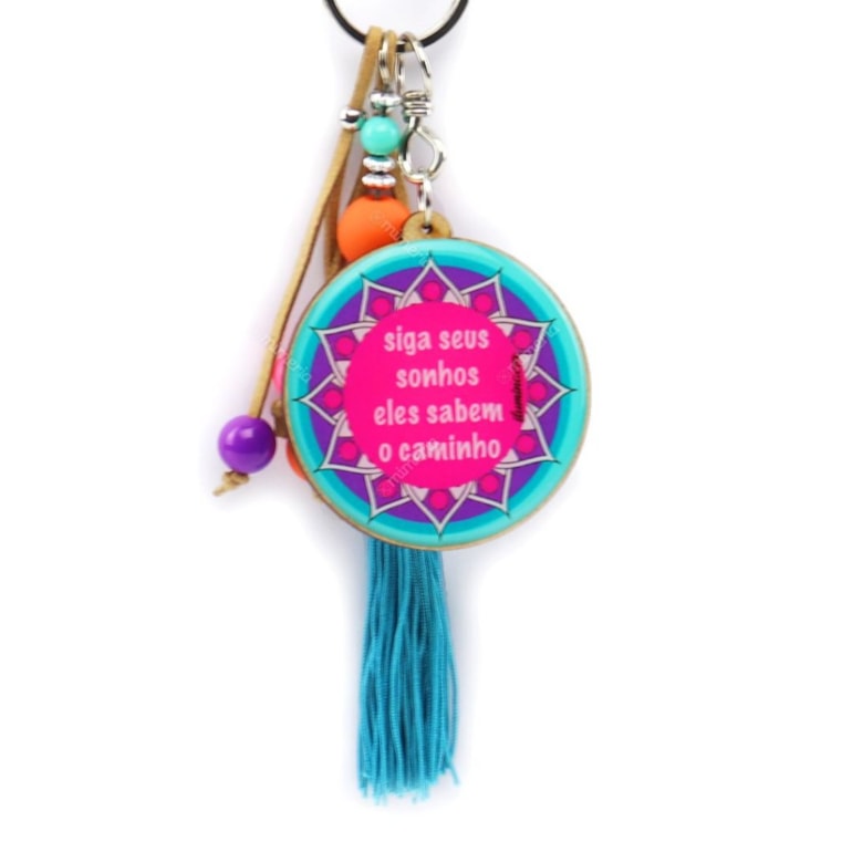 Produzido em materiais de alta qualidade, este chaveiro tem tag redonda estampada com uma mandala de flor e a frase: “Siga seus sonhos, eles sabem o caminho” em fundo em cores candy. Um verdadeiro mimo!
