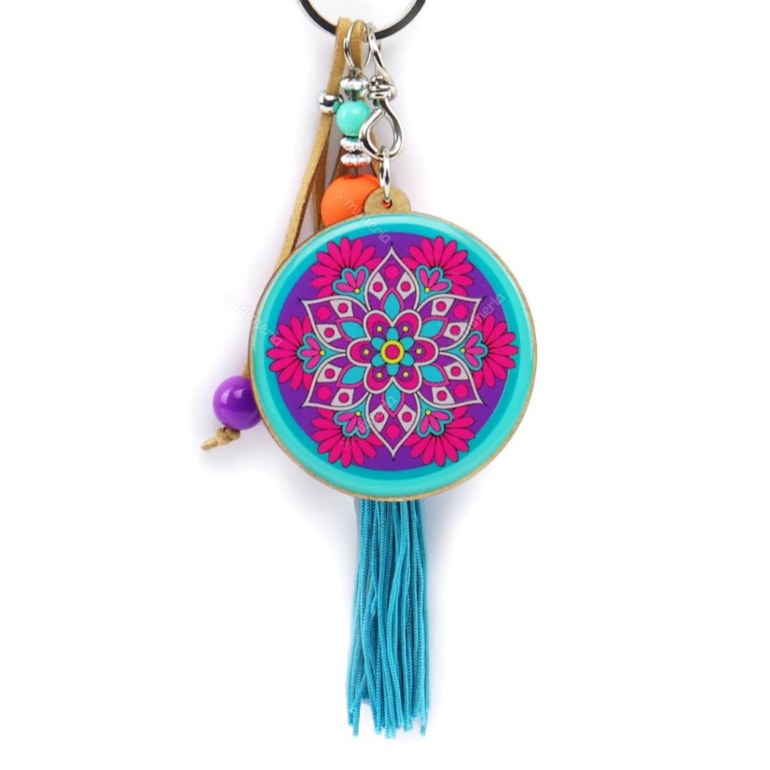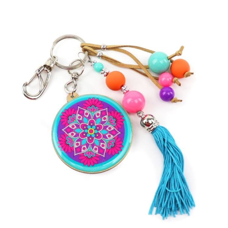 O Chaveiro Resinado Flor tem ferragens resistentes e conta com penduricalhos charmosos com miçangas e pompons. Tudo o que você poderia querer!