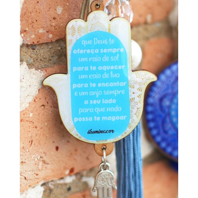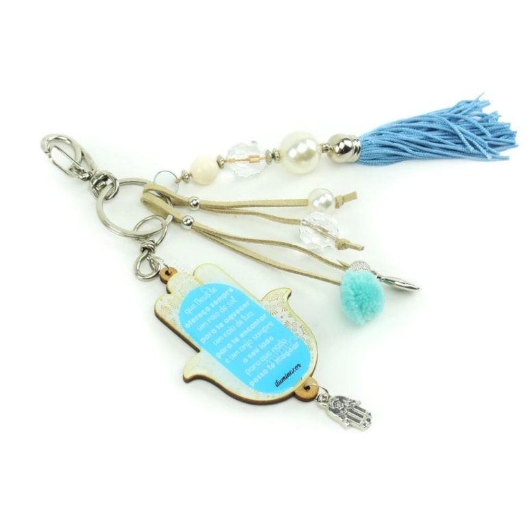 Produzido em materiais de alta qualidade, este chaveiro tem design único no formato Mão de Fátima estampada rendada com um olho grego no centro e na parte de trás uma frase inspiradora: “Que Deus te ofereça sempre um raio de sol para te aquecer, um raio de lua para te encantar e um anjo sempre a seu lado para que nada passa te magoar". Um charme!