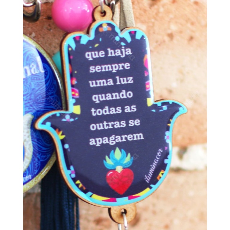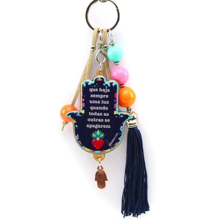 Produzido em materiais de alta qualidade, este chaveiro tem design único no formato Mão de Fátima todo colorido com o Sagrado Coração no meio e atrás a frase: “Que haja sempre uma luz quando todas as outras se apagarem." Não é lindo?