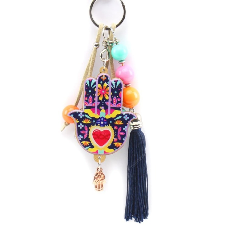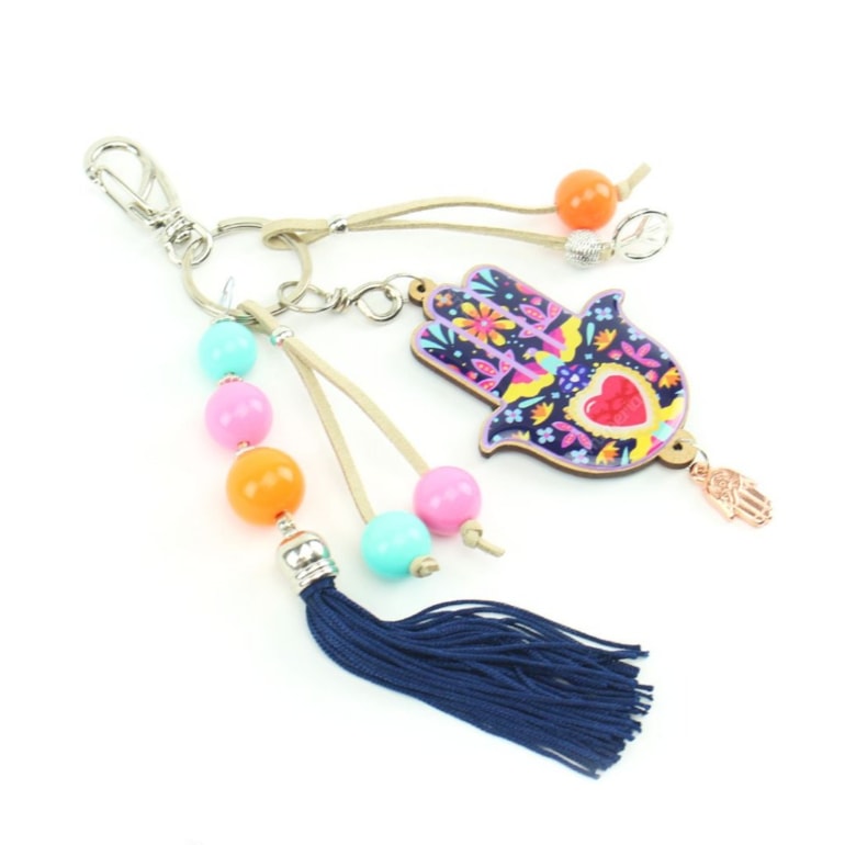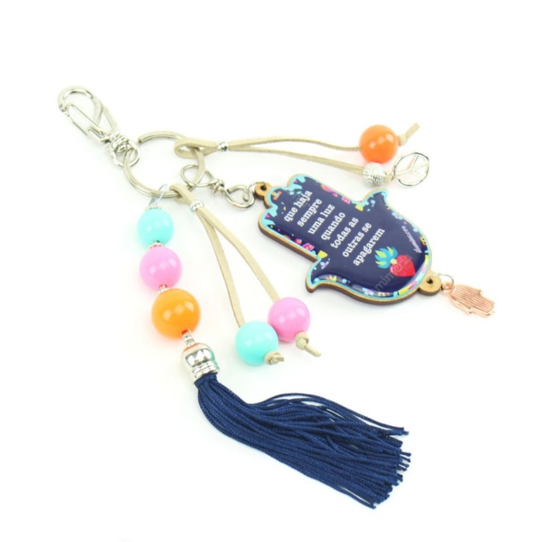 O Chaveiro Resinado Hamsa Sagrado Coração vem com penduricalhos de miçangas coloridas, franja e uma mini Mão de Fátima Rose Gold lindíssima! Perfeito para pendurar na bolsa e presentear pessoas queridas com goodvibes!