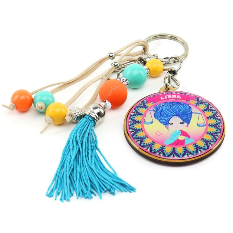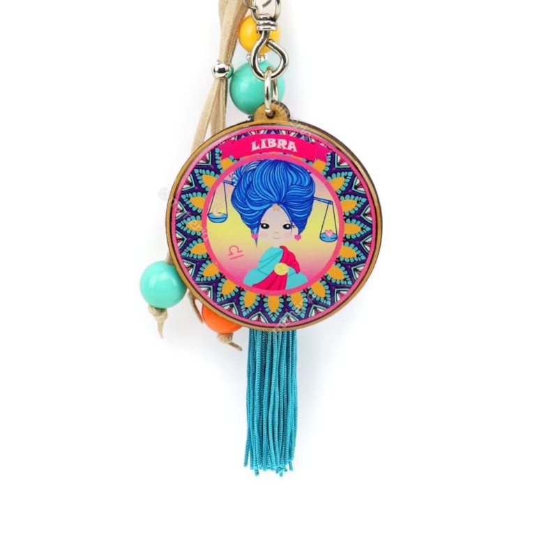O Chaveiro Resinado Libra é super lindo! Fabricado em MDF com resina acrílica, com o formato de tag redonda, tem estampado uma bonequinha com cabelos azuis com uma balancinha pendurada nos cabelos simbolizando o signo de libra com vários penduricalhos. Lindo!