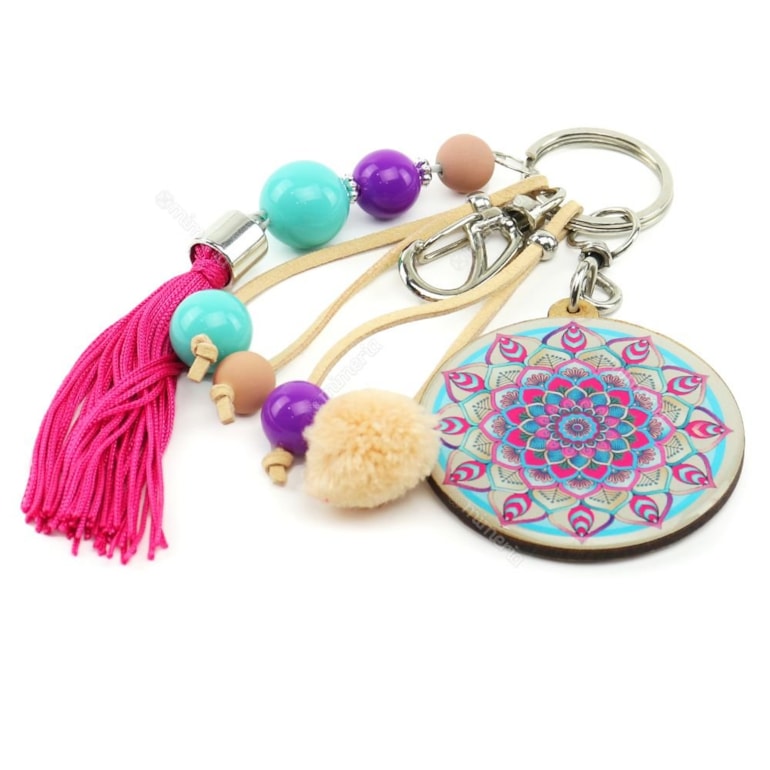 Com ele você pode pendurar suas chaves e ainda enfeitar sua bolsa ou mochila. A tag tem o formato redondo estampada uma mandala maravilhosa.