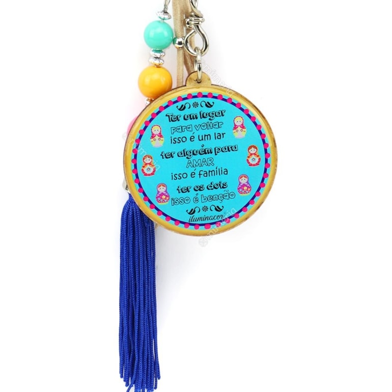 Fabricado com resina acrílica, esse chaveiro traz vários penduricalhos e no verso traz a mensagem: “Ter um lugar para voltar, isso é um lar; ter alguém para isso é família; ter os dois, isso é bênção”. Ideal para organizar todas suas chaves, além de trazer charme e estilo para sua bolsa, mala ou mochila. Um verdadeiro mimo!
