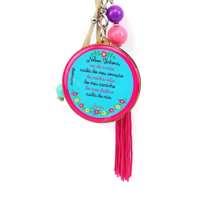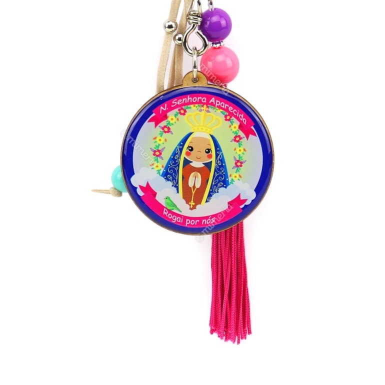 O Chaveiro Resinado Nossa Senhora da Aparecida é fabricado em MDF, resina acrílica, ganchinho e argola de metal, e traz também penduricalhos que combinam com a estampa. No verso traz a prece: "Nossa Senhora, me de a mão, cuida do meu coração, da minha vida, do meu caminho, do meu destino, cuida de mim. Amém! Presente fofo para todos os devotos de Nossa Senhora Aparecida.