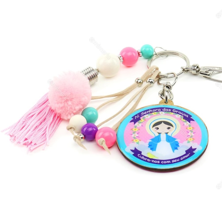 Fabricado em MDF, resina acrílica, ganchinho e argola de metal, o Chaveiro Resinado Nossa Senhora das Graças, também conhecida Santíssima Virgem Maria, traz alguns penduricalhos fofos que combinam com a estampa. No verso está escrita a prece: "Ó Virgem da medalha milagrosa, que de suas mãos voltadas pra o mundo chovam bênçãos e graças sobre nós. Amém”.