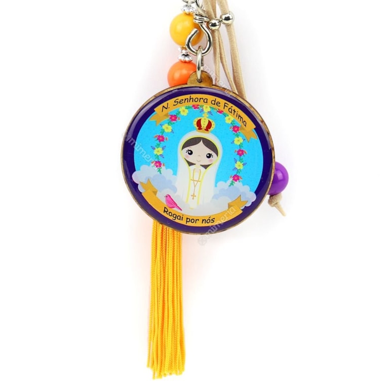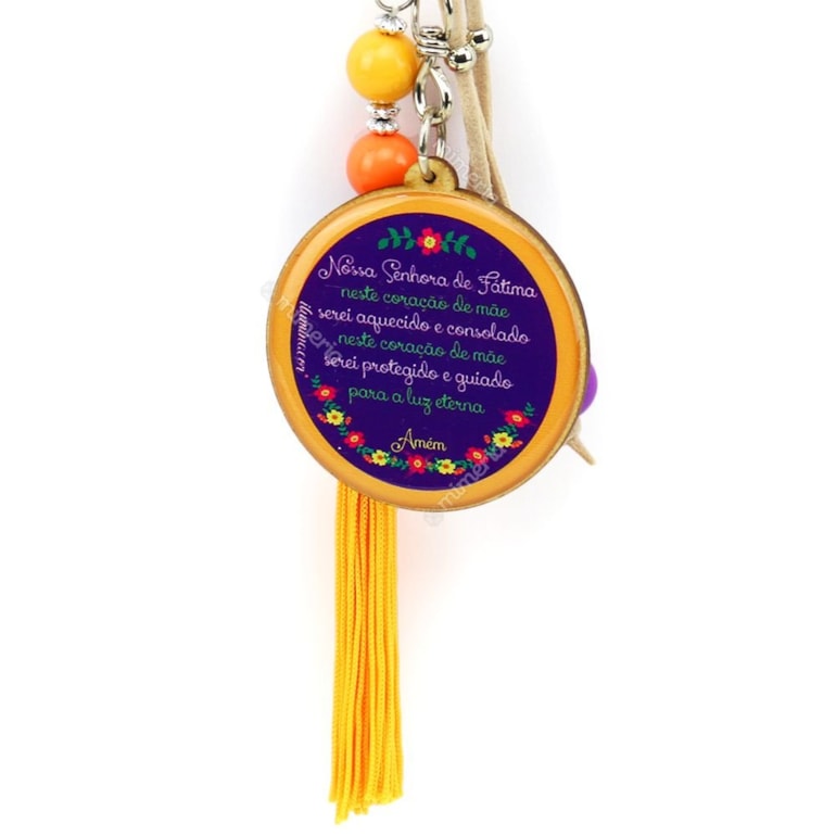 Fabricado em MDF, resina acrílica, ganchinho e argola de metal, o Chaveiro Resinado Nossa Senhora de Fátima, traz no seu verso a prece: “Nossa Senhora de Fátima, neste coração de mãe serei aquecido e consolado. Neste coração de mãe serei protegido e guiado para a luz eterna. Amém”.