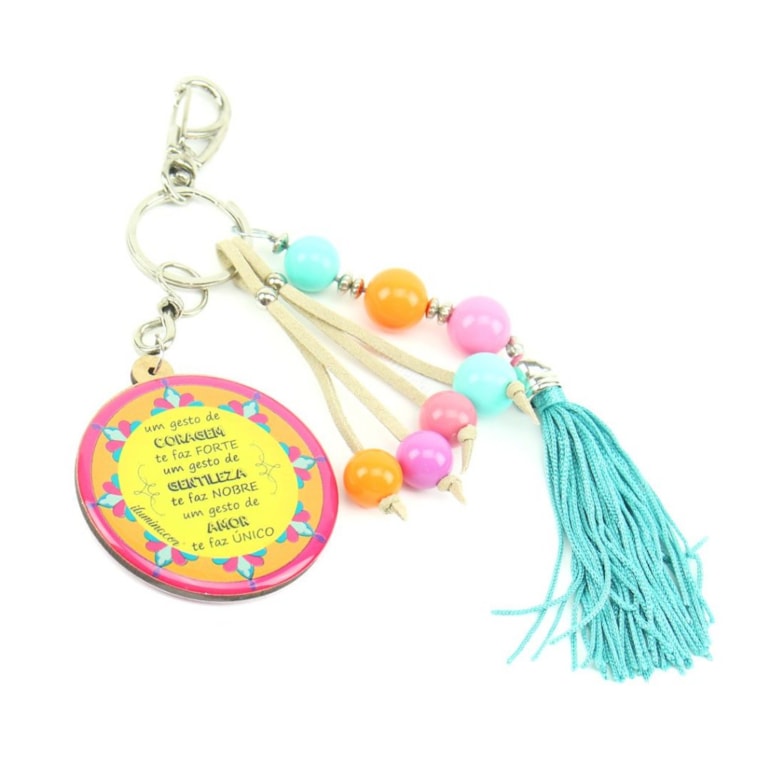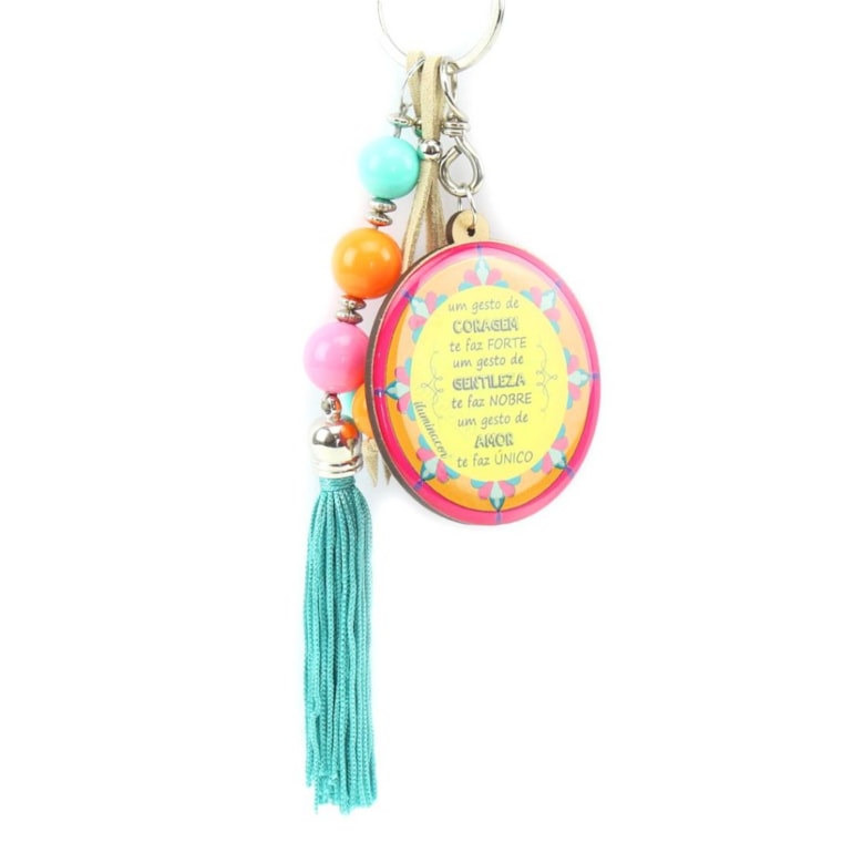 O Chaveiro Resinado Rosa dos Ventos tem tag decorada dos dois lados: um estampado com a rosa dos ventos e o outro com a frase: um gesto de coragem te faz forte, um gesto de gentileza te faz nobre, um gesto de amor te faz único.