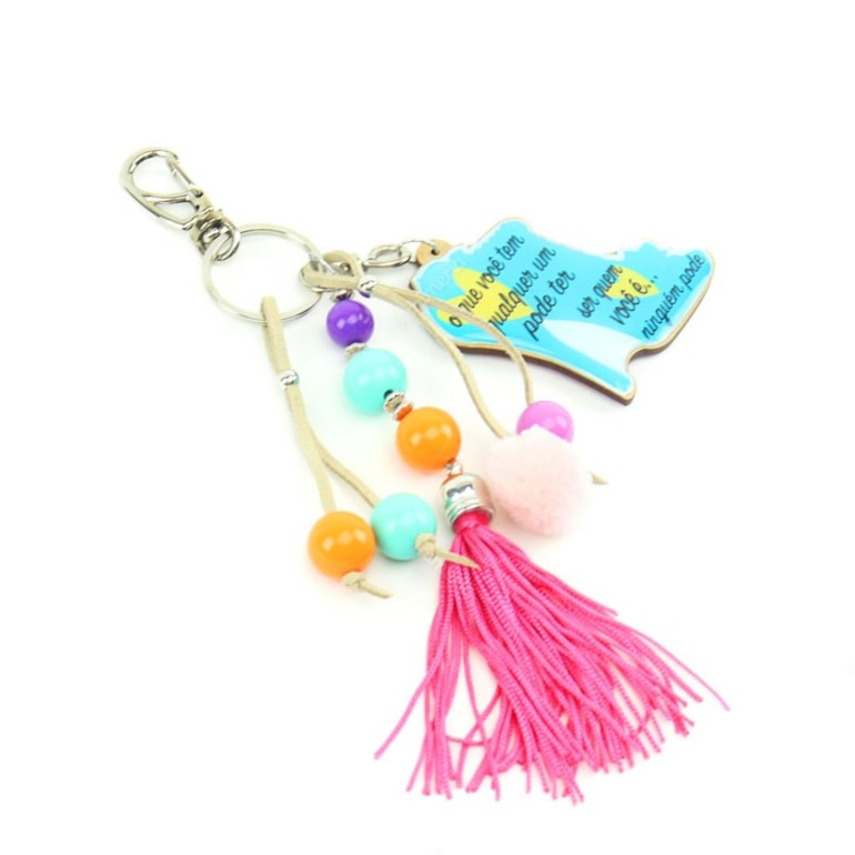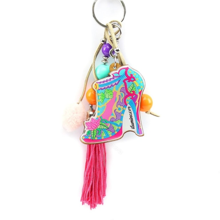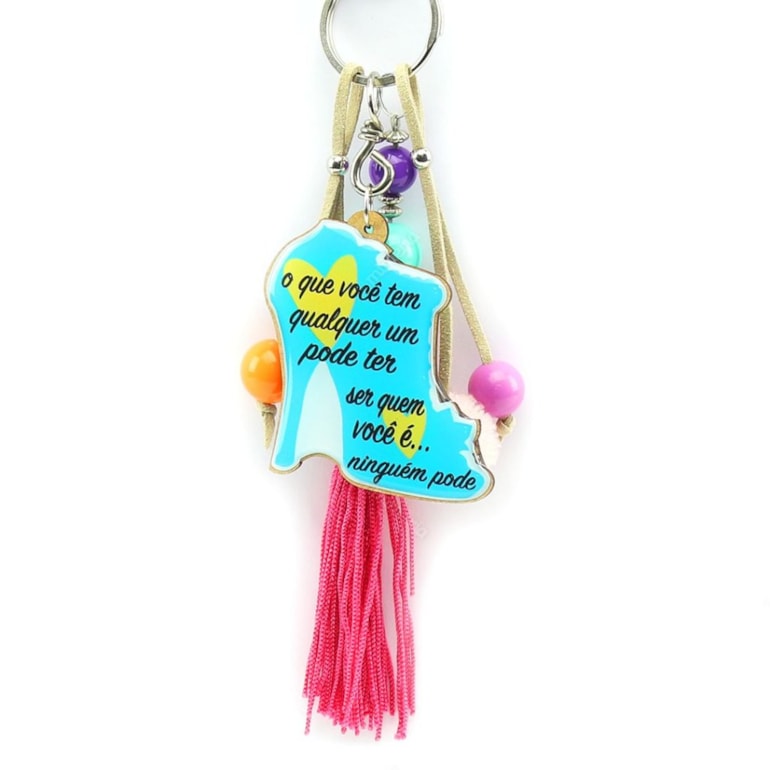 Com o formato da tag de um sapato de salto alto, esse chaveiro todo colorido traz ainda a frase: "O que você tem qualquer um pode ter. Ser quem você é ... ninguém pode".