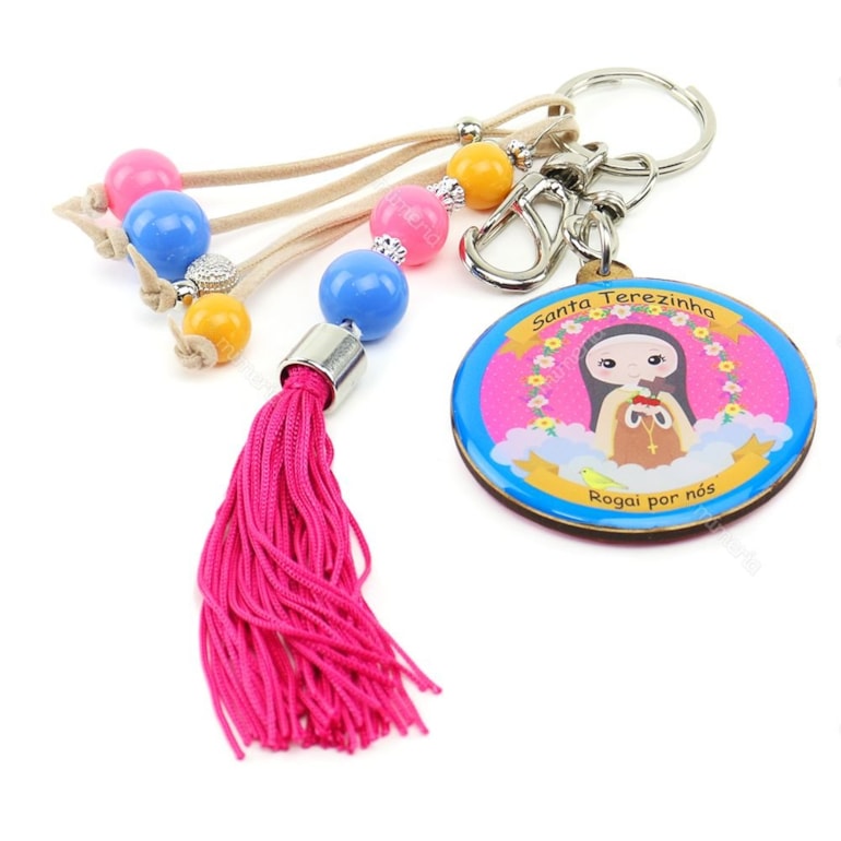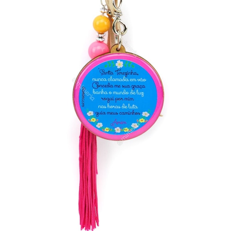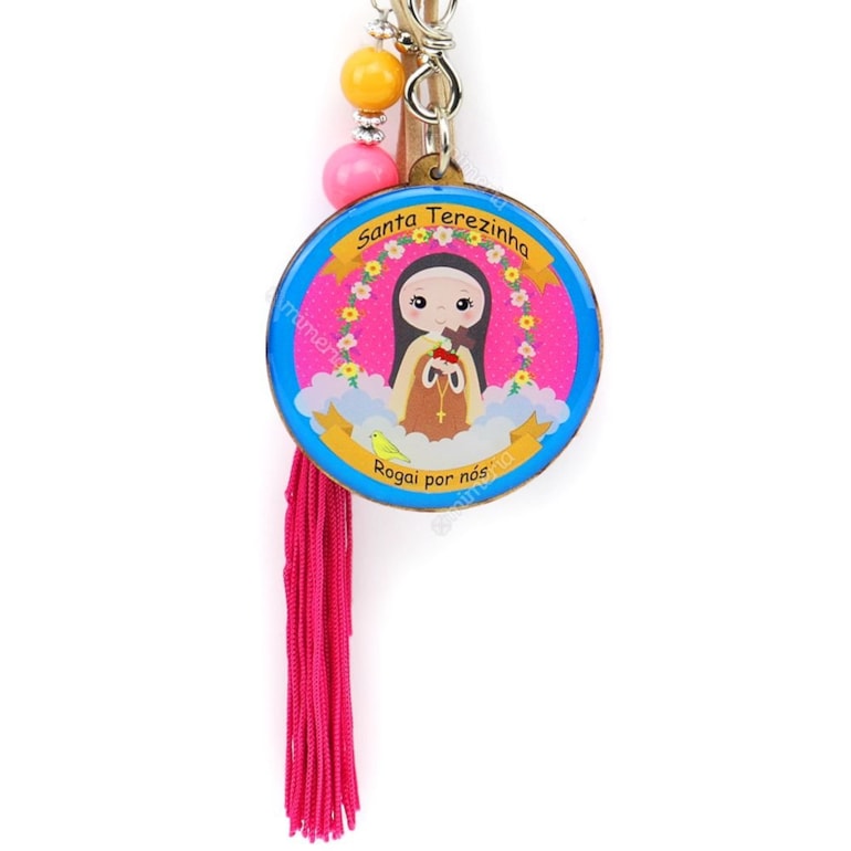 Fabricado em MDF, resina acrílica, ganchinho e argola de metal, o Chaveiro Resinado Santa Terezinha traz também alguns penduricalhos fofos que combinam com a estampa. No verso está escrita a prece: "Santa Terezinha nunca chamada em vão. Conceda-me sua graça. Banha o mundo de luz, rogai por mim na horas de luta. Guia meus caminhos. Amém."
