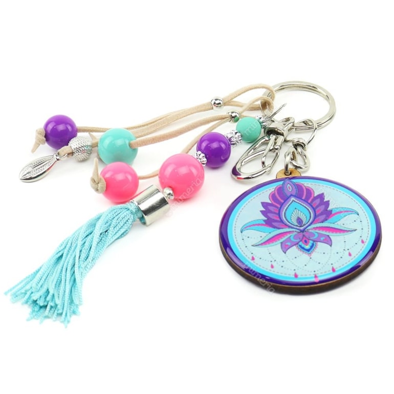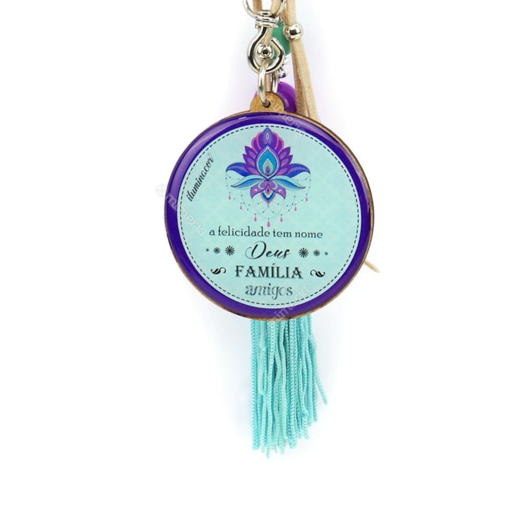 A tag tem o formato redondo estampada uma linda flor nas cores roxa, rosa e azul turquesa. Lindíssimo! Fabricado com resina acrílica, traz ainda penduricalhos que combinam com a estampa. No verso uma mensagem inspiradora: “A felicidade tem nome Deus, família, amigos”. Que mimo!