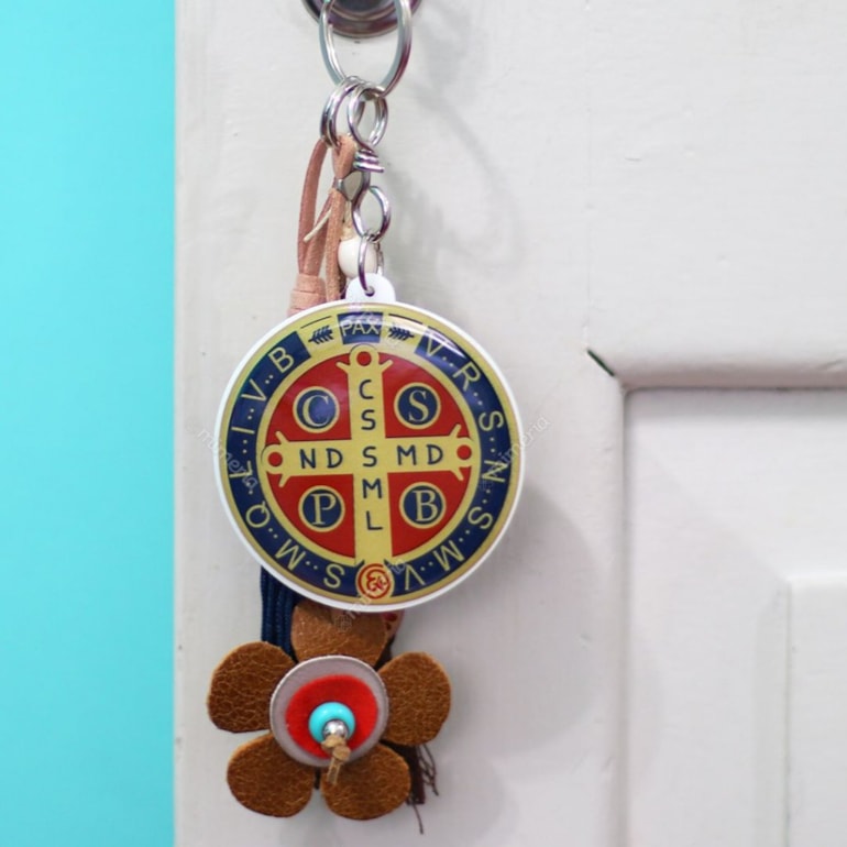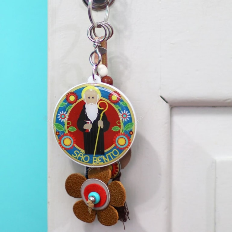 Fabricado em material plástico com resina acrílica, o Chaveiro São Bento traz penduricalhos fofíssimos que remetem a estampa, como uma mini medalhinha. Simplesmente muito charmosa! Você pode colocar suas chaves na argolinha que acompanha o Chaveiro São Bento e um ganchinho bem prático ajuda a pendurar na bolsa. Imagina que lindo pendurado na sua bolsa, sacola ou mochila?!