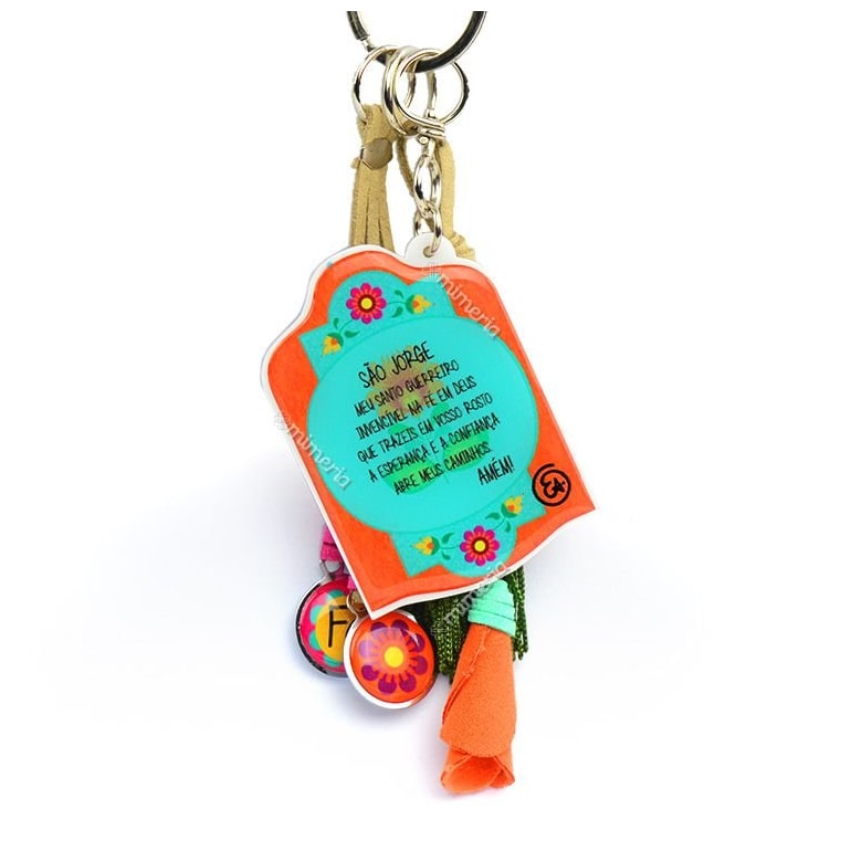 Fabricado em material plástico com resina acrílica, o Chaveiro São Jorge traz também penduricalhos que combinam com a estampa. No verso traz a prece: "Meu santo guerreiro invencível na fé em Deus, que trazei em vosso rosto a esperança e a confiança, abre meus caminhos"