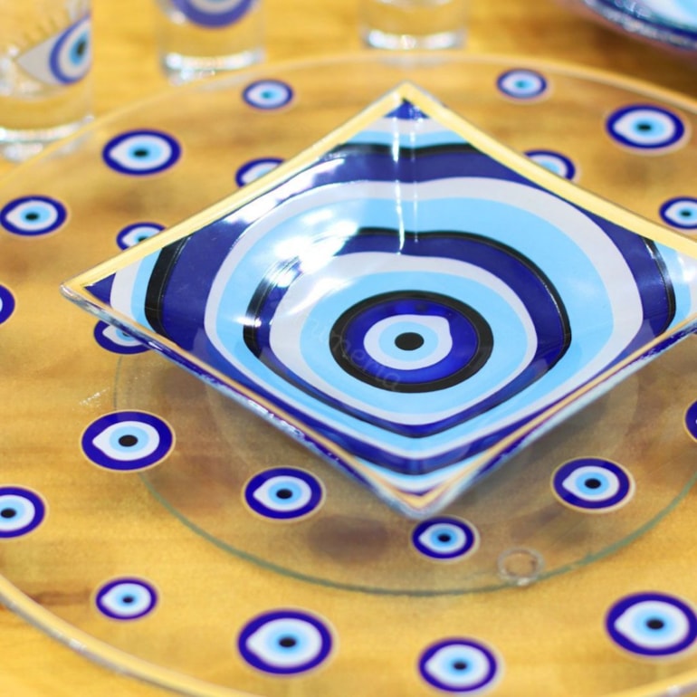 - Conjunto de 2 Pratinhos de Vidro Quadrado Olho Grego;