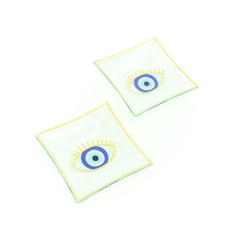 O Conjunto de 3 Petisqueiras de Vidro Olho Grego é composto por três pratinhos diferentes: dois quadrado e um retangular, todos com um olho grego no centro e diferentes estampas e pinturas no entorno.