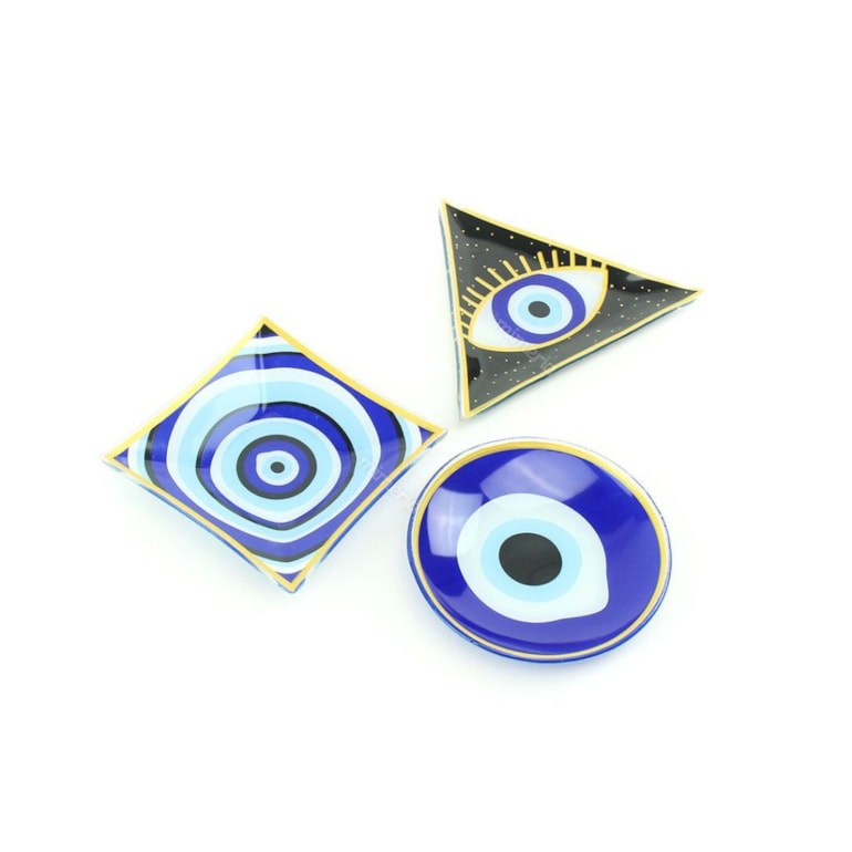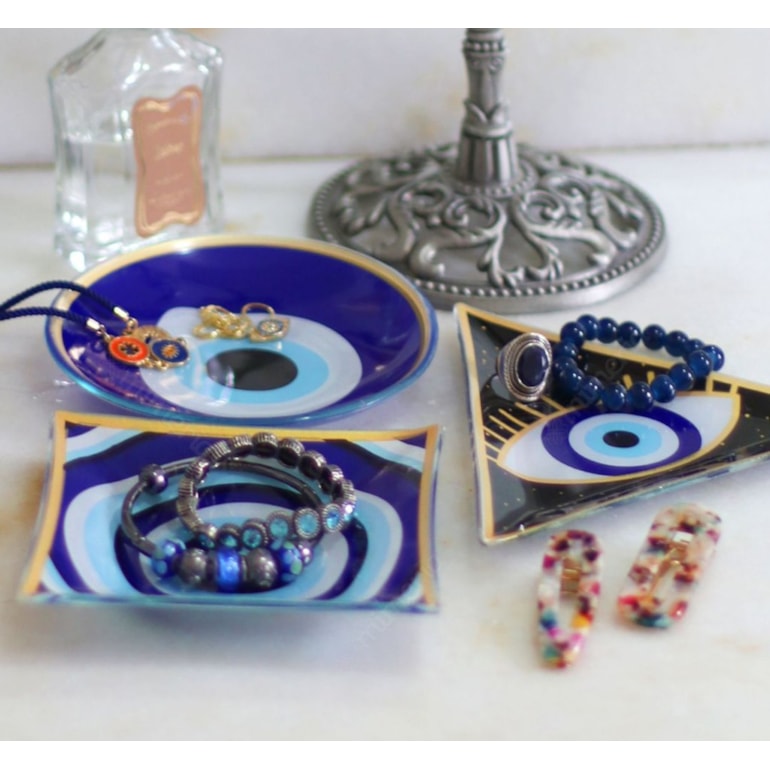 Perfeito para decorar um aparador ou estante do seu quarto para colocar colares, anéis e o que mais quiser. O Conjunto de 3 Pratinhos de Vidro Olho Grego Geométricos é ideal para levar só good vibes.