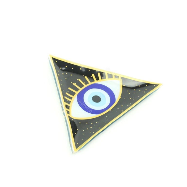 O Conjunto de 3 Pratinhos de Vidro Olho Grego Geométricos é composto por três pratinhos diferentes, sendo um quadrado, um triângulo, um redondo, todos estampados com olhos gregos e com uma linda borda dourada!