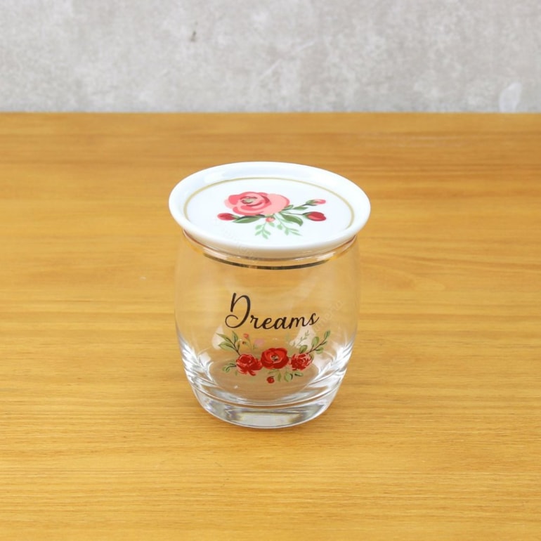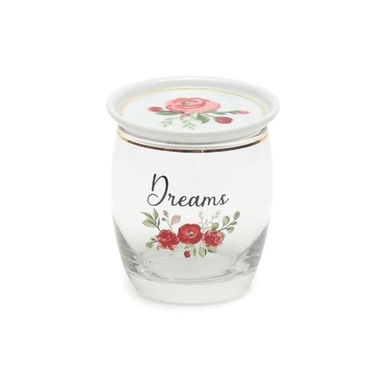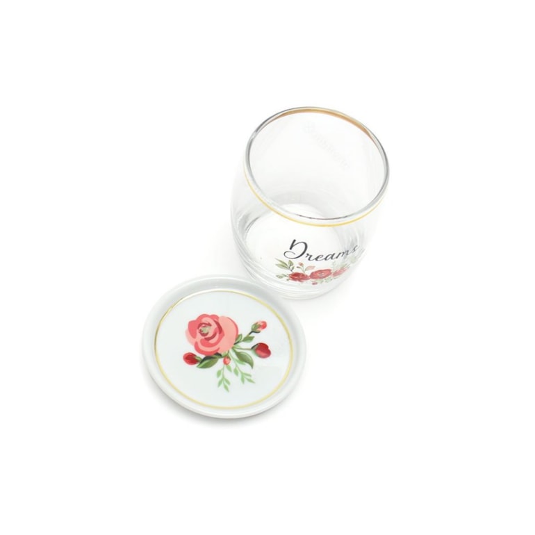 Super fofo, este copo tem linda estampa de flores e a palavra: “Dream” em fundo transparente e tampa de porcelana estampada com flor com detalhes em dourado filetados em ouro. Um charme de peça para você combinar com outros itens da mesma coleção e decorar sua casa com personalidade!