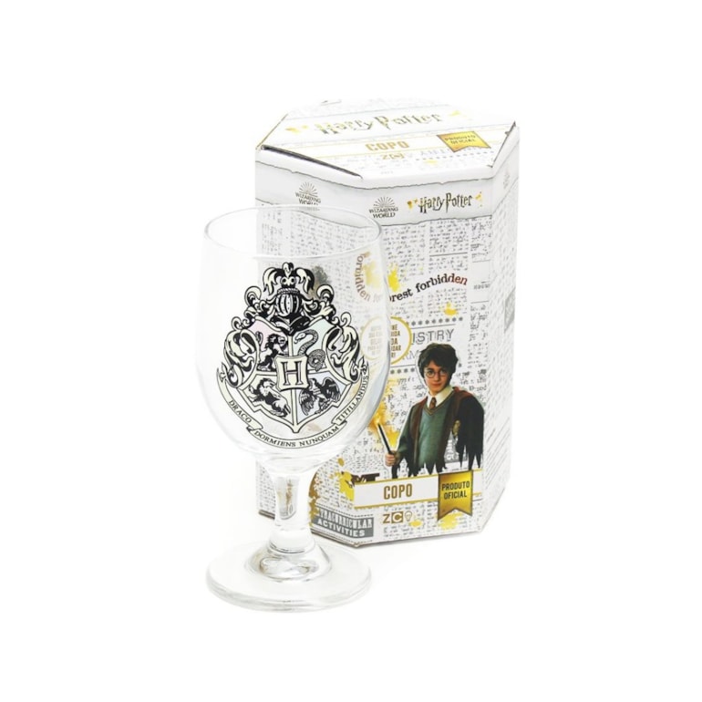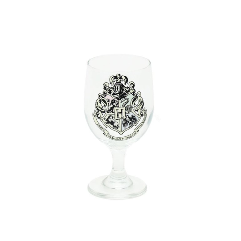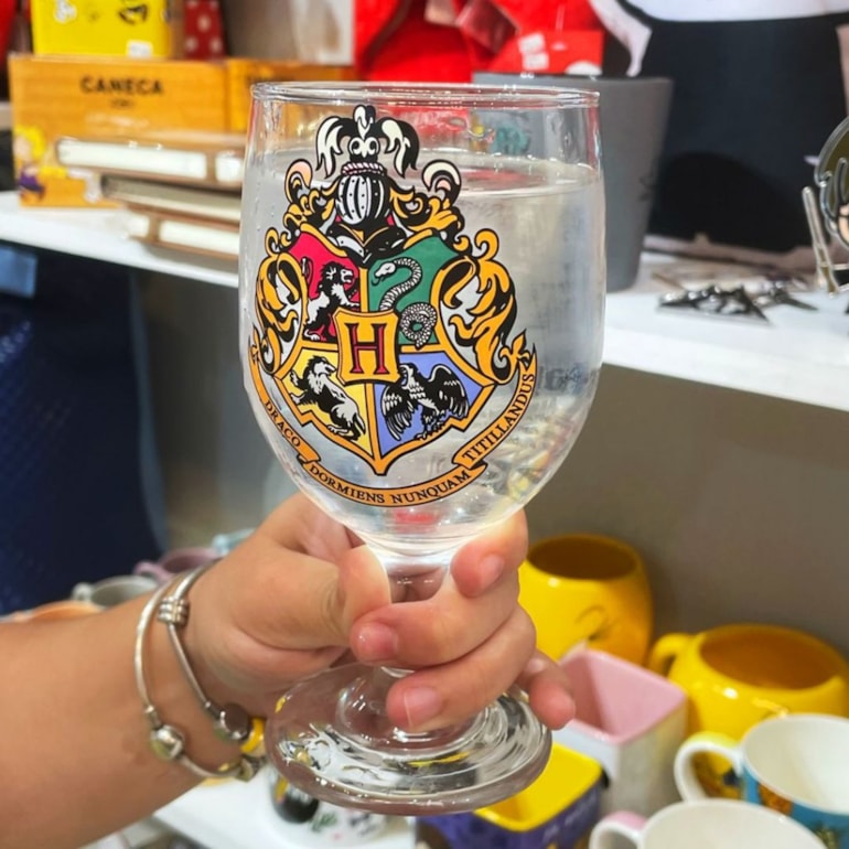 Lindo, ele vem com um design de taça todo trabalhado sobre vidro transparente e conta com o brasão de Hogwarts bem clarinho, que muda de cor após ser preenchido com bebida gelada, liberando cores mais fortes e vibrantes em sua estampa central!