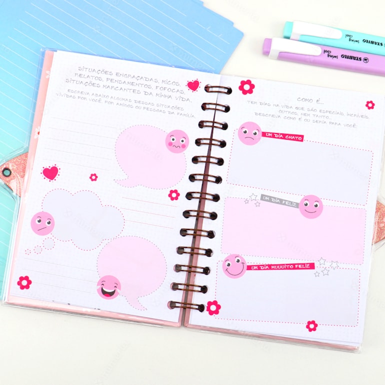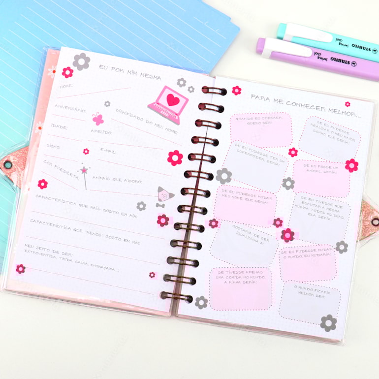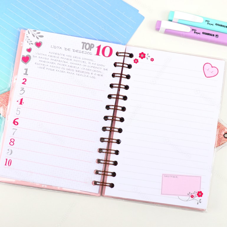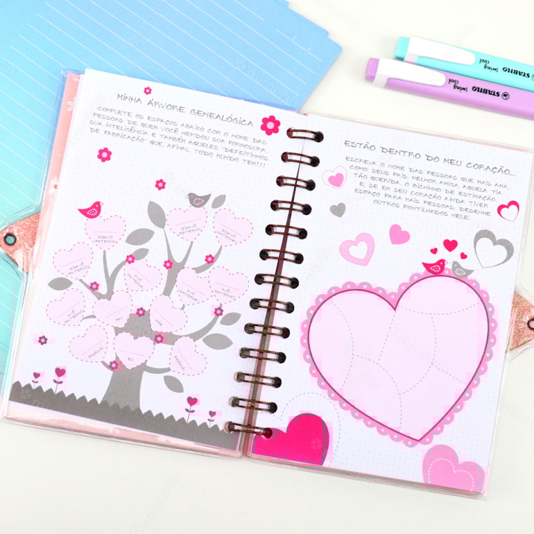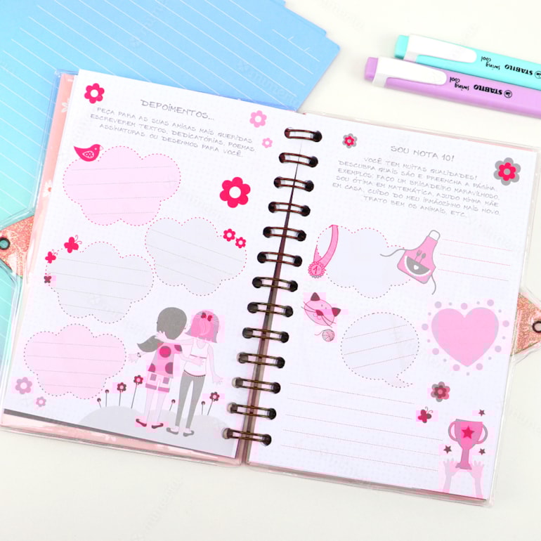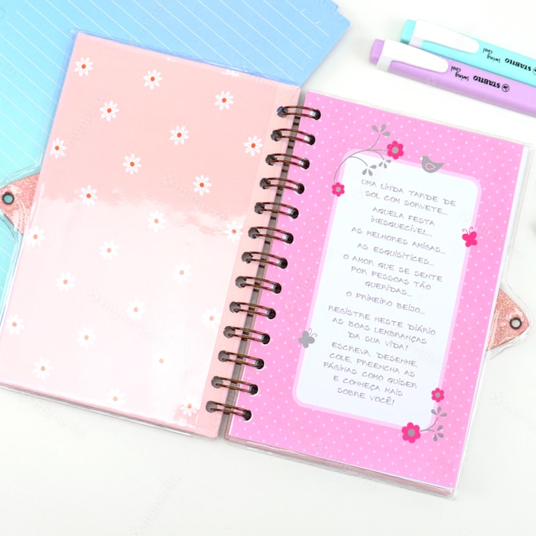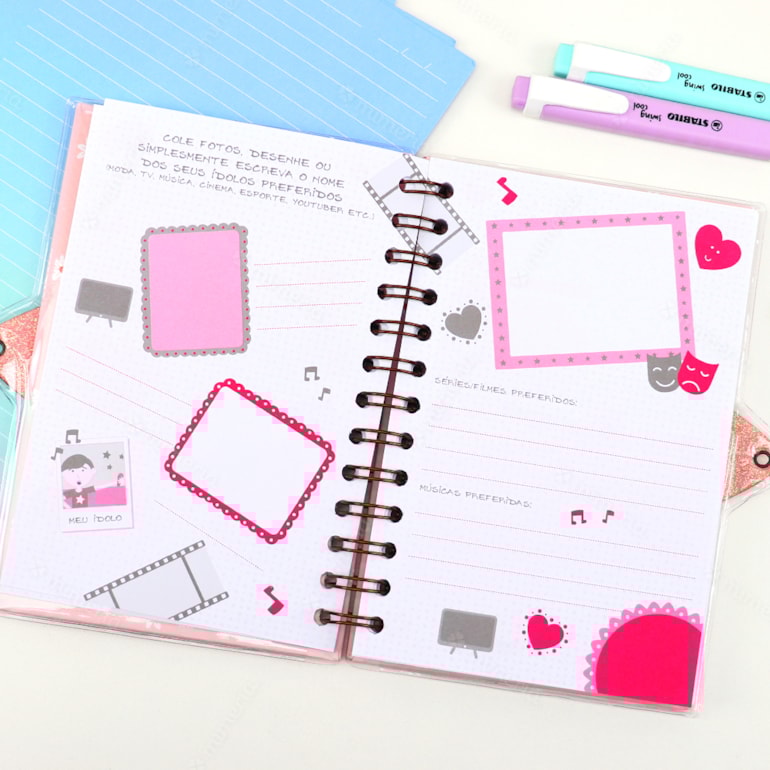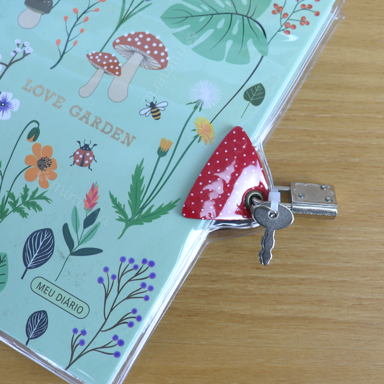Ele apresenta um design mega delicado, capa dura, com fundo verde claro e estampas que remetem a um delicado jardim. Conta com encadernamento wire-o, o que proporciona maior resistência e qualidade ao produto. Vem também com cadeado e chave, então seus segredos estarão permanentemente bem guardados. Legal, né? Além disso, as folhas são pautadas, com coração e flores estampadas e as primeira páginas são criativas – contém espaços para você colocar seus filmes favoritos, músicas, fotos e declarações de suas melhores amigas.