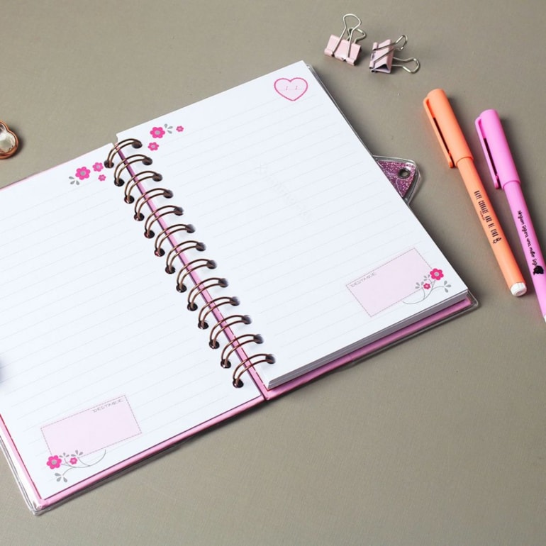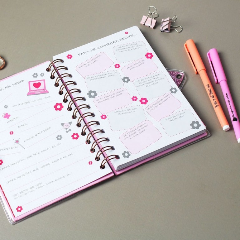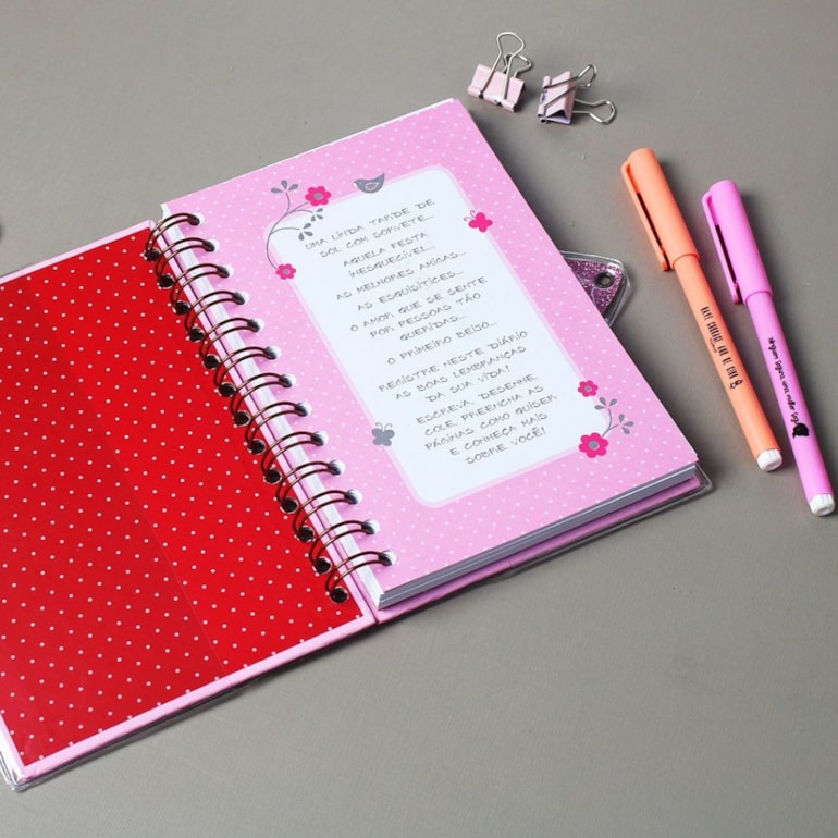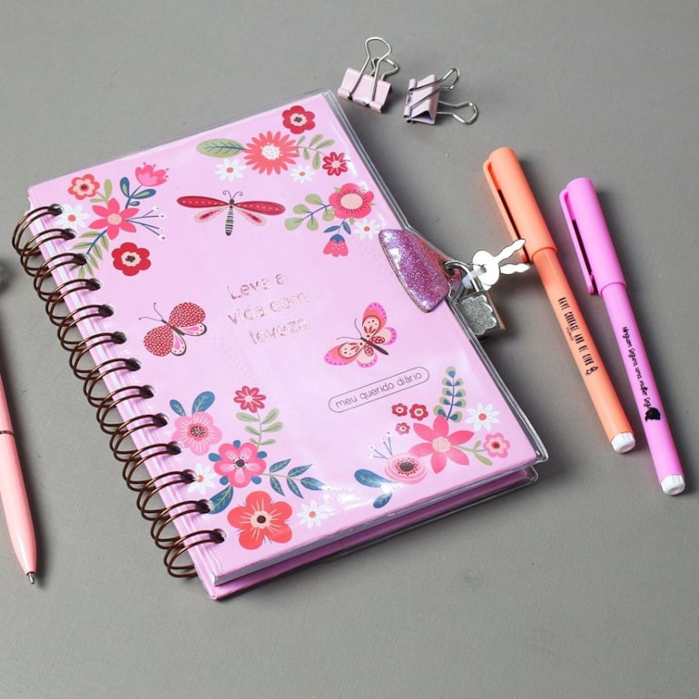 Lindinho, este diário tem fechamento à chave e conta com capa toda decorada com borboletas, flores e a frase: “Leve a vida com leveza” em fundo rosa. Um charme!