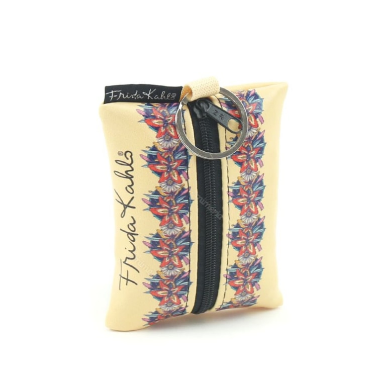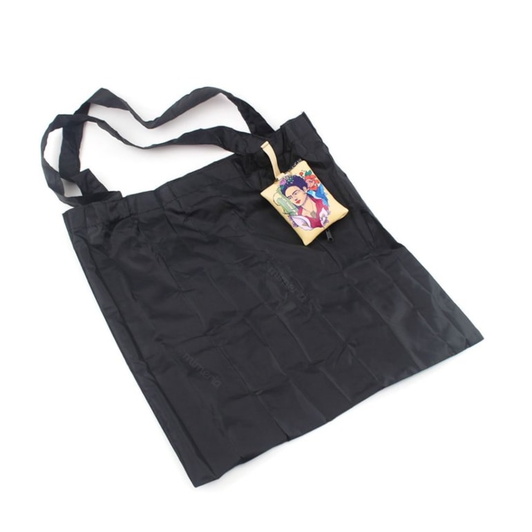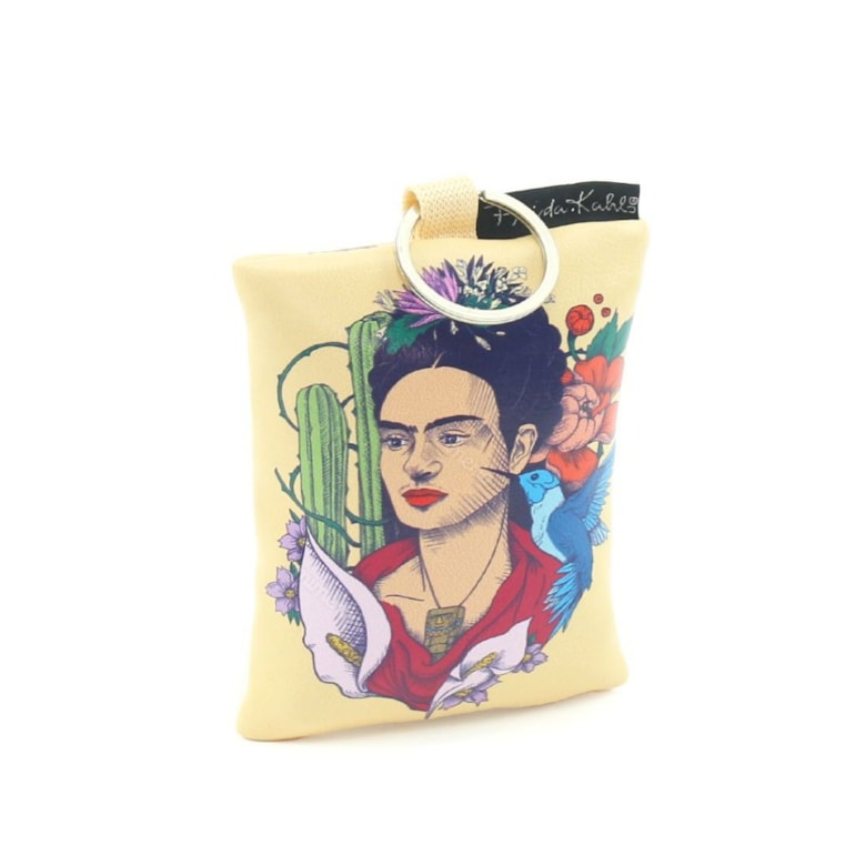 Com sistema inteligente, esta ecobag vem dobradinha dentro de um lindo chaveiro no formato de almofadinha com fechamento em zíper e estampa com o retrato da Frida. Simplesmente maravilhosa!