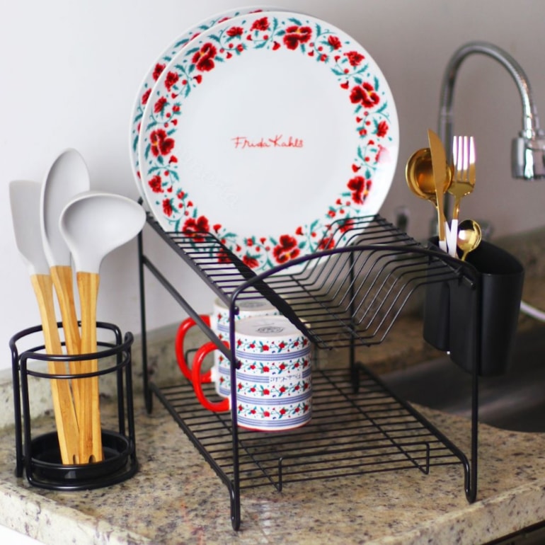 Feito com material de ótima qualidade, conta com dois andares e tem capacidade até 16 pratos além de ter espaço para colocar panelas, copos potes e uma caixinha para talheres acoplada a sua lateral, é tudinho o que você precisa para uma pia super organizadinha!
