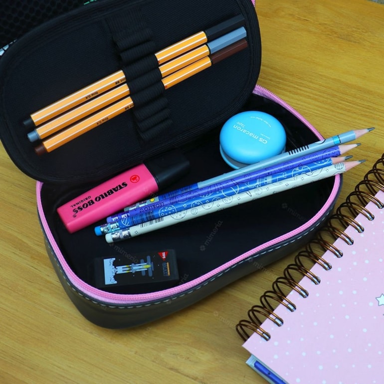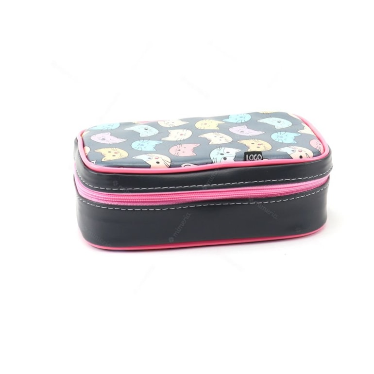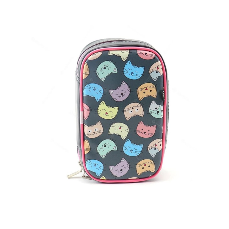 Produzido com materiais de alta qualidade, ele apresenta fechamento em zíper, forro interno em poliéster, o que garante proteção e comodidade para suas canetas. Há também elástico para acomodar marcar-textos, canetas, lápis e dentre outros. A parte de fora é estampada com gatinhos fofinhos e coloridos em fundo preto.
