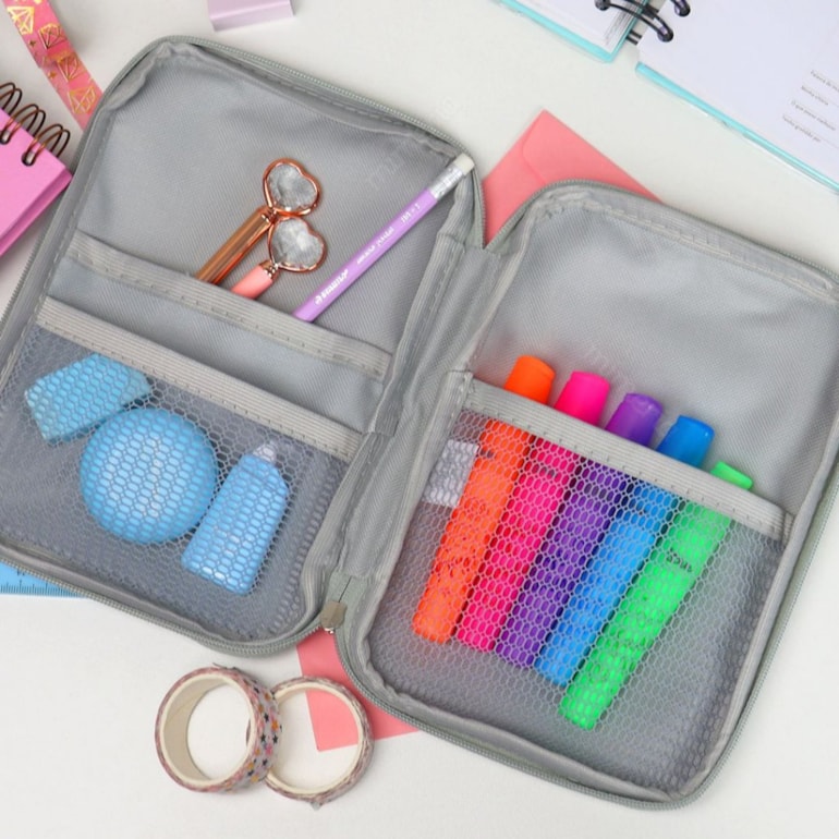 O Estojo Case Holográfico Mexe Comigo Mas não Mexe nas MInhas Canetas é super prático e versátil. Você pode organizar seus materiais escolares, como washi tapes, brush pen, usar como necessaire, guardar suas makes, pincéis e tudo mais que você quiser! Combine com outros itens da linha!