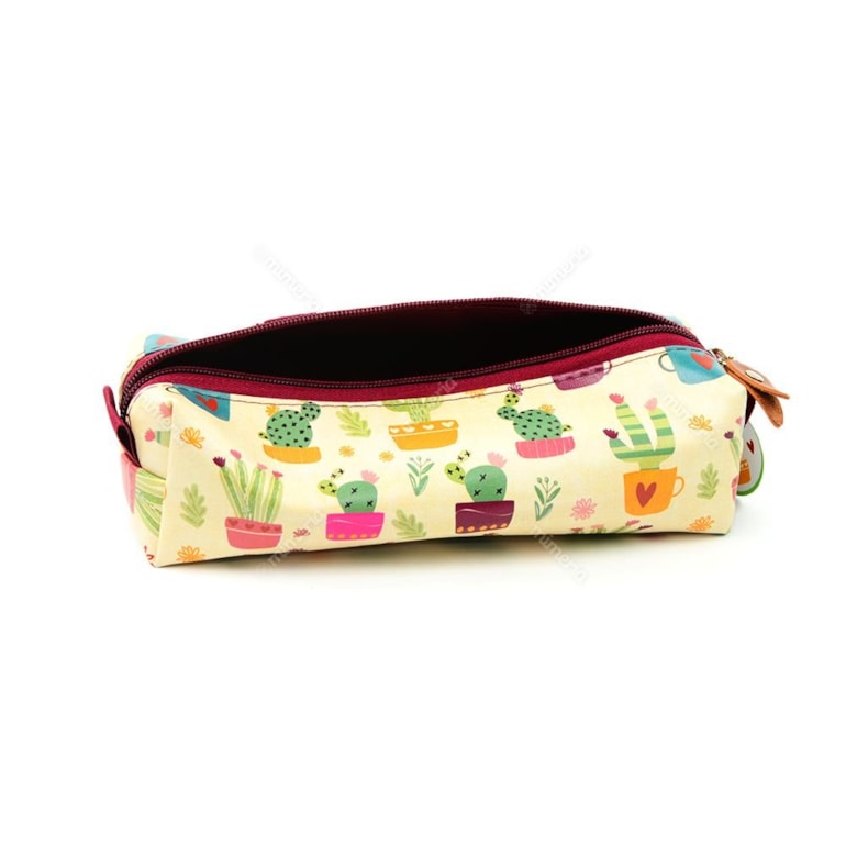 Esse Estojo de Couro Estampado Cactus é muito estiloso e criativo. Todo estampado com cactos, tem etalhes em areia e vinho, super charmoso, além de ser funcional e ajudar na organização e transporte de objetos de escritório.