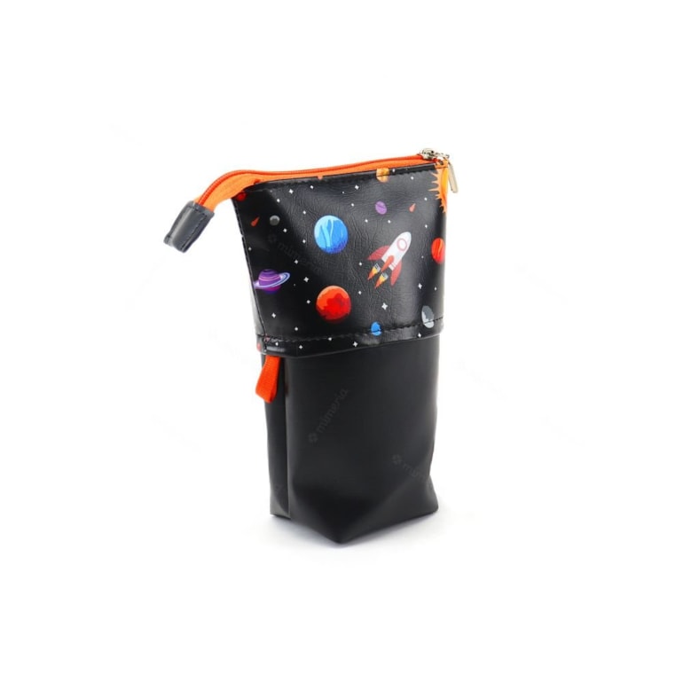 Confeccionado com policloreto de vinila (PVC), poliéster e algodão de alta qualidade, ele também conta com um design encantador – apresenta planetas, foguetes, estrelas e asteroides estampados em fundo preto. Além disso, ele é retrátil, então pode ficar de pé. Isso mesmo, suas canetas poderão ficar guardadas na sua mesa de pé ou deitadas dentro da sua mochila.