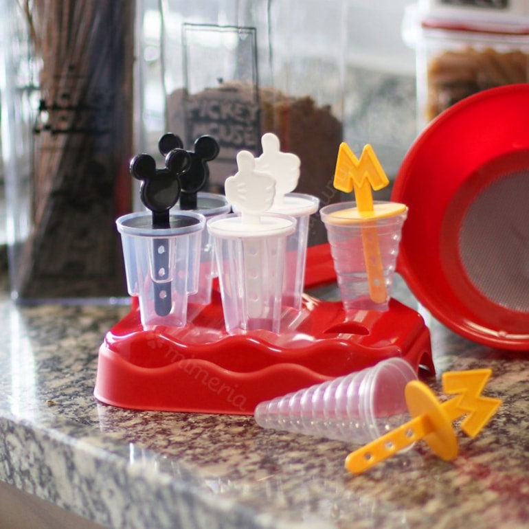 Produzido com material de alta qualidade, o plástico é livre de BPA – substância tóxica que alguns tipos de plástico têm, portanto você e sua família podem utilizar o produto em segurança. Composto por 1 base e 6 formas, os palitinhos que sustentam o picolé são super criativos – têm o formato da mãozinha e do rostinho do Mickey e a inicial do nome dele também.