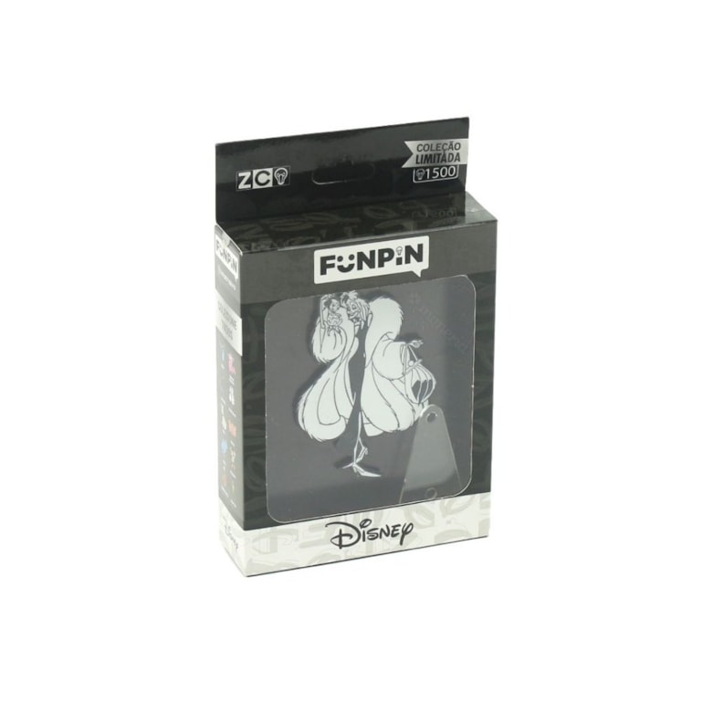 Produzido em metal, ele vem no formato da Cruella com detalhes impecáveis e toda trabalhada em preto e branco! Ele possui duas travas de metal traseiras que facilitam sua fixação em bolsas, peças de roupa e afins, impedindo que o mesmo seja perdido com facilidade, além de também vir com um suporte transparente para deixar o seu funpin paradinho, seguro e exposto na sua estante!