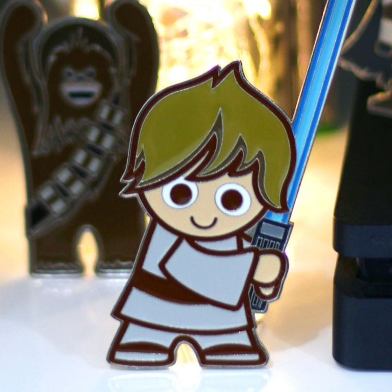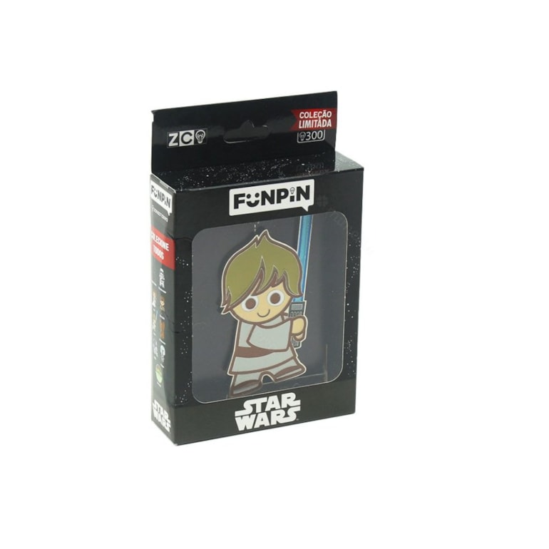 Trabalhado em metal, ele vem no formato do Luke portando um sabre de luz e produzido com muita riqueza de detalhes! Ele possui duas travas de metal traseiras que facilitam sua fixação em bolsas, peças de roupa e afins, impedindo que o mesmo seja perdido com facilidade, além de também vir com um suporte transparente para deixar o seu funpin paradinho, seguro e exposto na sua estante!