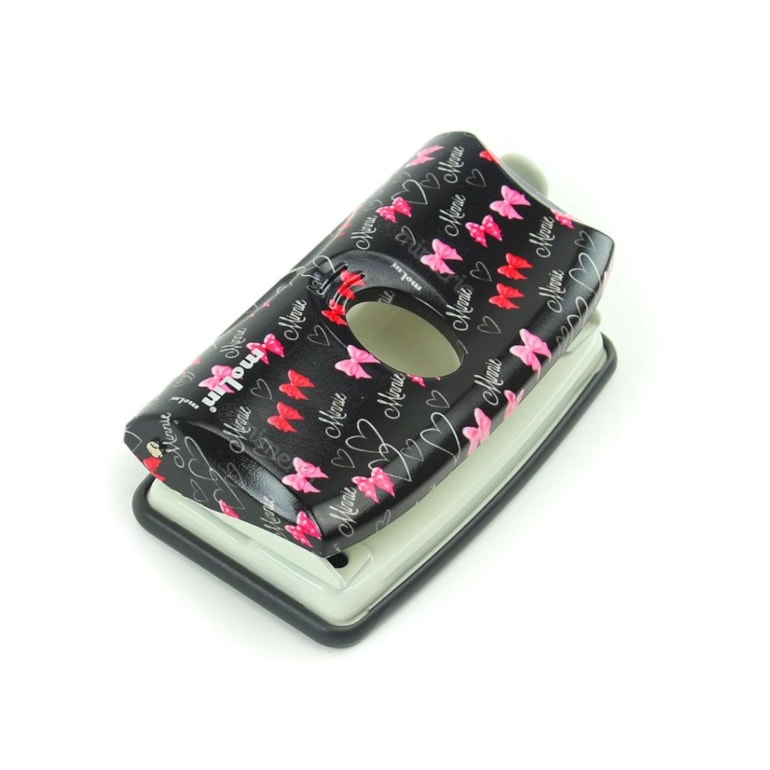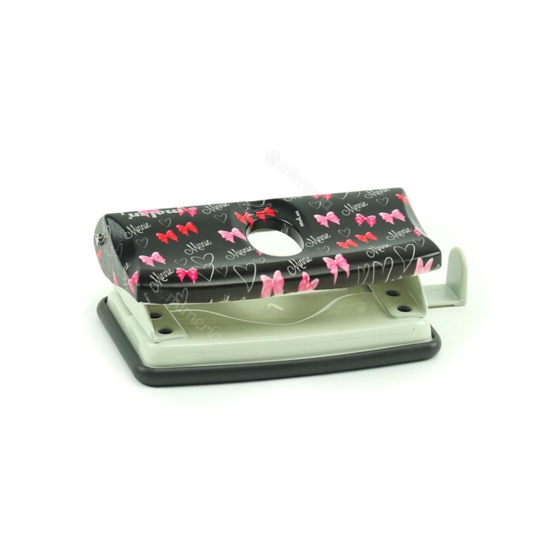 O Furador de Folhas Minnie Mouse tem linda estampa de lacinhos rosas em fundo preto remetendo à personagem Minnie Mouse. Um verdadeiro mimo!