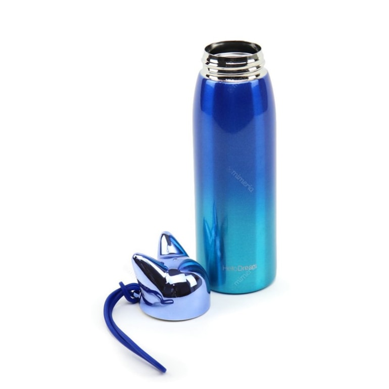 Produzida em aço inoxidável, é térmica, com capacidade para 300 ml e conta com excelente qualidade. Com fundo metálico em degradê com tons de azul lindíssimo, tem tampa com o formato da cabecinha de uma raposinha e ainda conta com um elástico na porta de trás para pendurar na bolsa ou na mochila. Fofura!