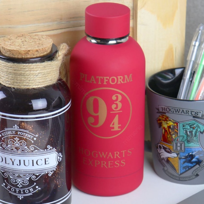 Produzida em aço inoxidável, tem excelente qualidade e conta com um acabamento emborrachado. Seu design é incrível, vem na cor vermelha com detalhes em dourado, conta com o símbolo e o nome do mais famoso expresso de hogwarts!
