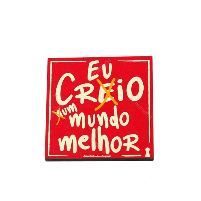 Ideal para decorar geladeiras e placas metálicas, possui material magnético, é produzido em madeira e vai ficar lindo na decor da sua cozinha, varanda, churrasqueira e outros lugares que queira enfeitar. Com fundo vermelho, é estampado com uma tipografia divertida com a mensagem: "Eu crio(ei) (n)um mundo melhor". Na verdade no lugar de dizer: "Eu creio num mundo melhor", se quer dizer: "Eu crio um mundo melhor", uma atitude muito mais ativa, não?