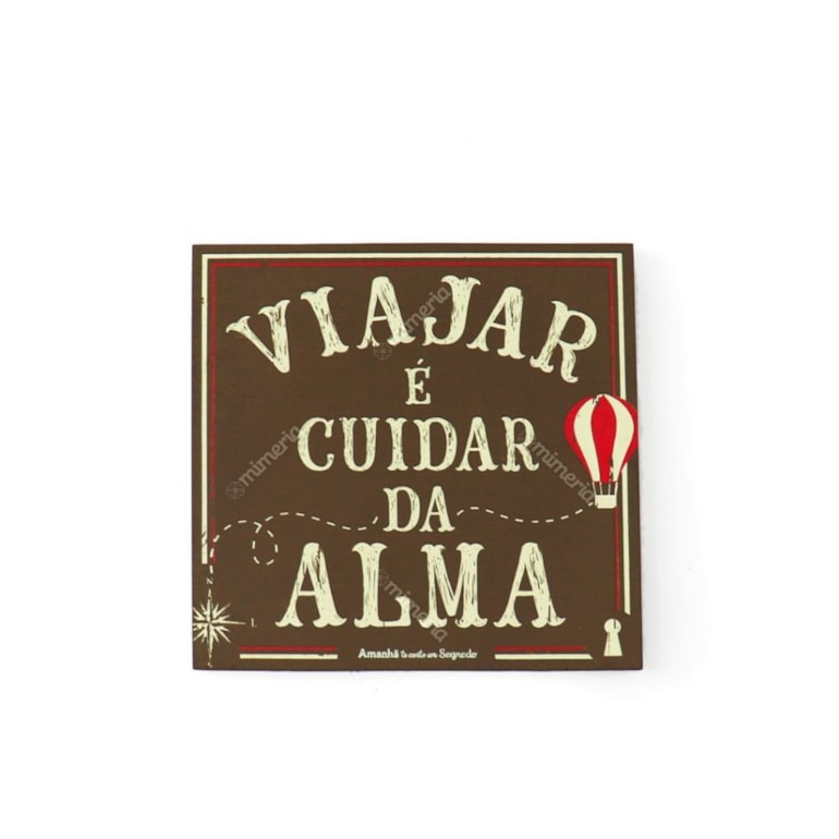 Produzido em MDF, tratado e envernizado, com fundo marrom, é decorado com tipografia caprichada e traz a frase: “Viajar é cuidar da alma” com um balãozinho desenhado. Super fofo.