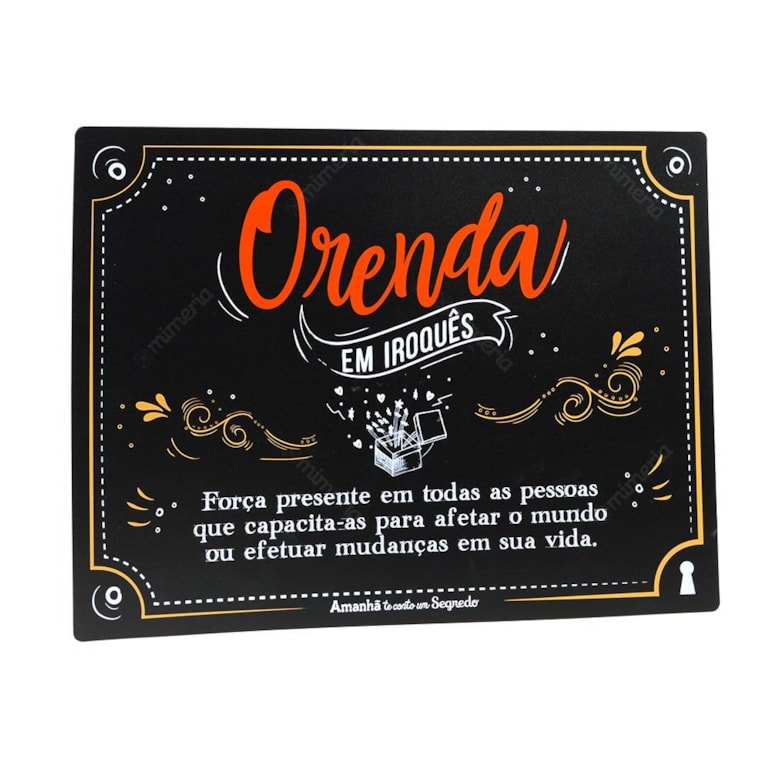 O Jogo Americano Orenda é estiloso e funcional. Na cor preta, é estampado com um livro, uma caixa de presente com corações e estrelas, além da palavra Orenda em laranja, e ainda vem com o significado, que em iroquês (pertence a família linguística da América do Norte) que quer dizer: "Força presente em todas as pessoas que capacita-as para afetar o mundo ou efetuar mudanças em sua vida".