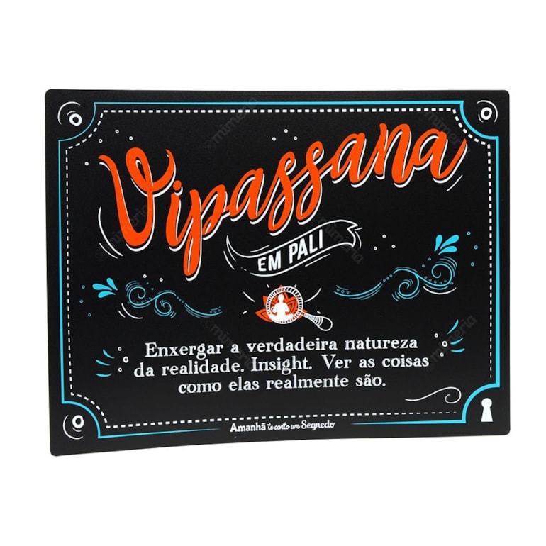 O Jogo Americano Vipassana é lindo e super moderno. Fabricado em plástico (TPU), na cor preta, é estampado com uma pena, arabescos e a palavra Vipassana em laranja, e ainda vem com o significado, que em Pali que quer dizer: "Enxergar a verdadeira natureza da realidade; Insight; Ver as coisas como elas realmente são." Pali é uma língua antiga indiana, uma forma simplificada de sânscrito.